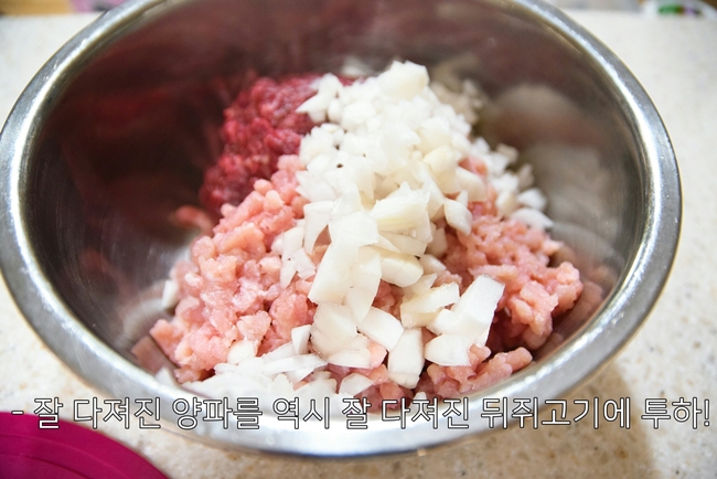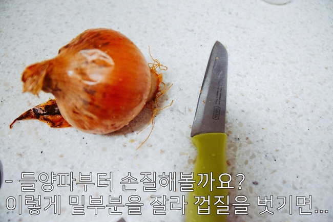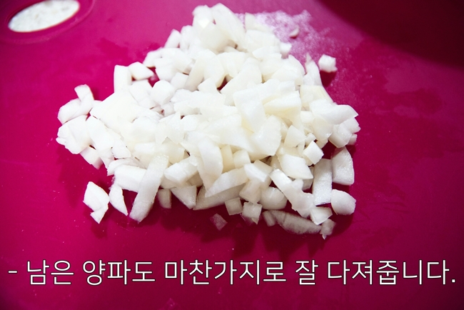 - 양파를 다질 때는 세로로 칼집을 일정하게 넣고, 가로로도 칼집을 넣어준 다음 챱챱 썰면 편합니다.