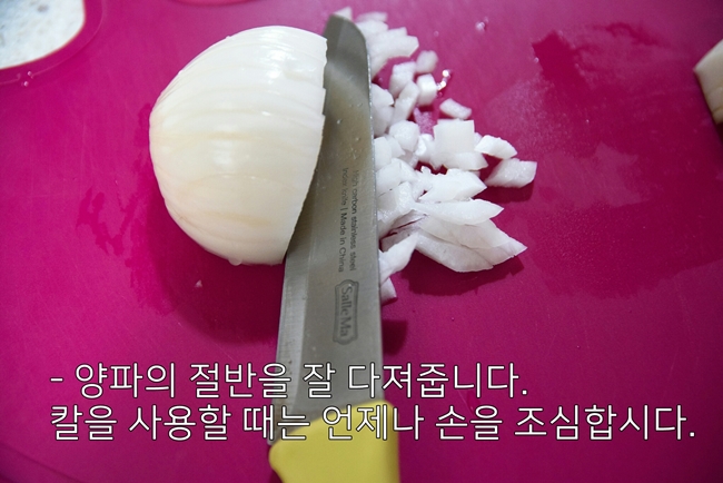 양파를 썰어야지 여러분의 손은 썰어버리면 안 됩니다. 양파의 매움까지 더해져 고통도 두 배가 됩니다.