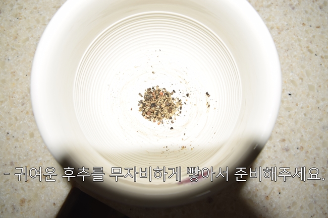 - 요리 직전에 통후추를 갈아서 쓰는 편이 더 향미가 좋긴 합니다만 일반적인 후추를 쓰셔도 상관 없습니다.