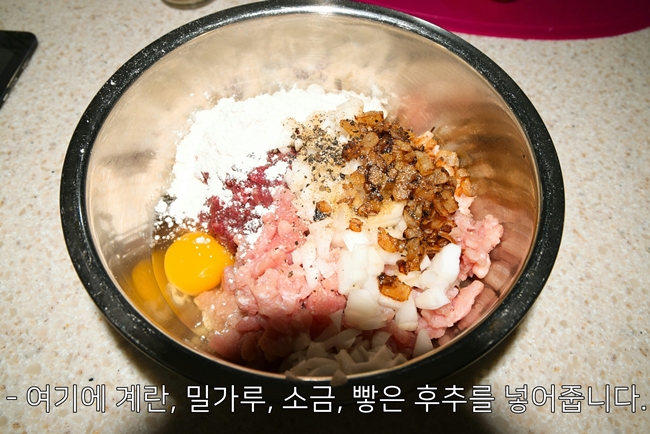 - 보통은 여기에 빵가루도 들어갑니다만 저는 없어서 생략했습니다.밀가루나 빵가루의 양은 반죽하면서 잘 조절해주세요.
