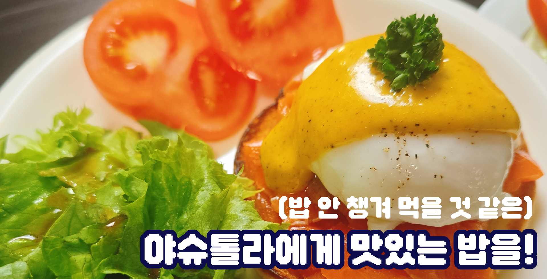 마지막으로 올랑데즈 소스를 뿌리고, 곁들여 먹을 샐러드와 토마토까지 올려줍니다.