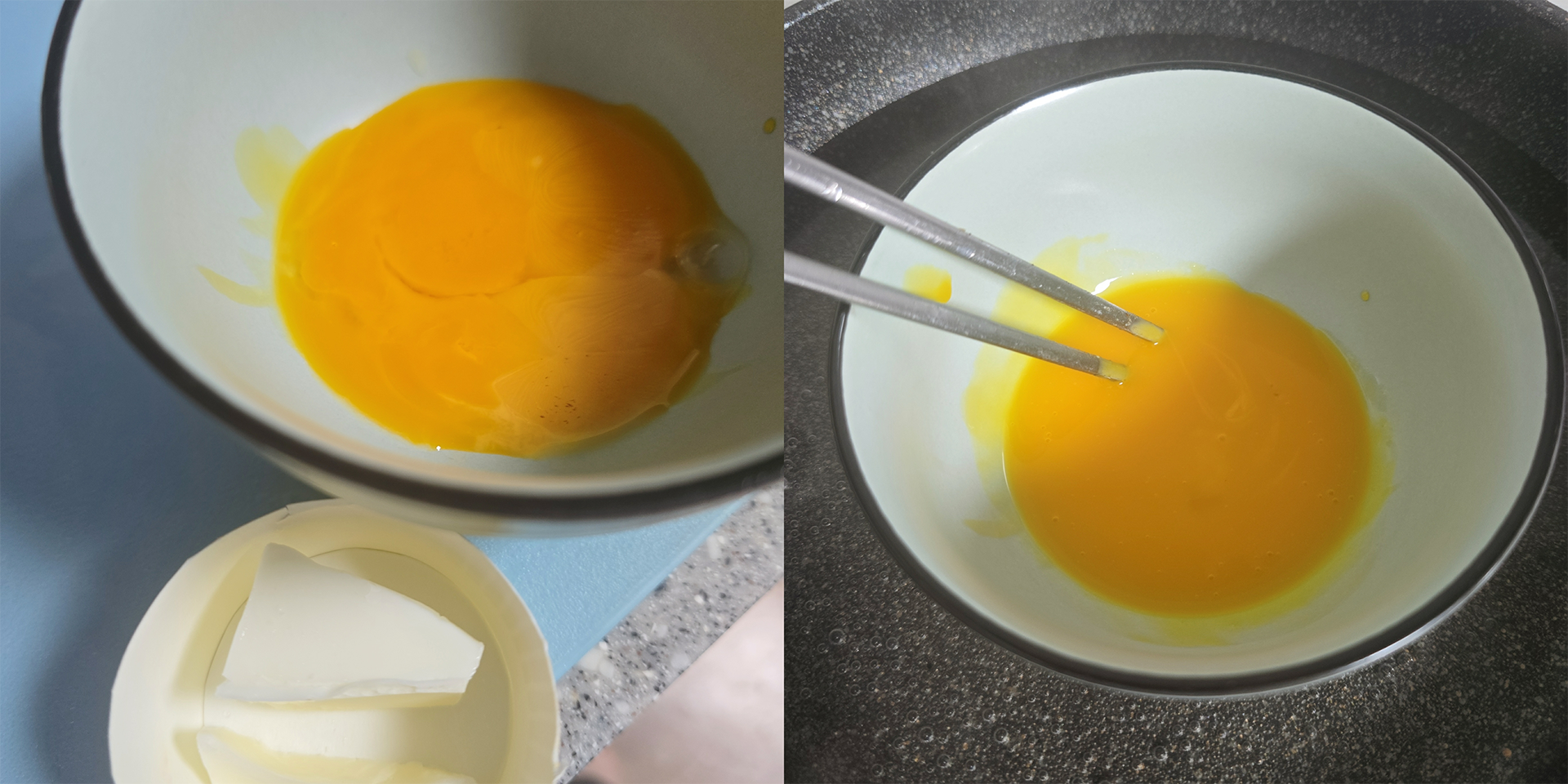일단 계란 노른자 2개를 분리해주고, 버터는 대충 눈대중으로 넣었어요.