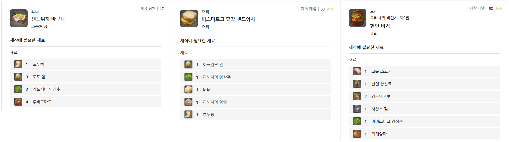 [비스마르크 달걀 샌드위치], [샌드위치 바구니], [현인 버거]의 각각 재료는 아래와 같은데요.