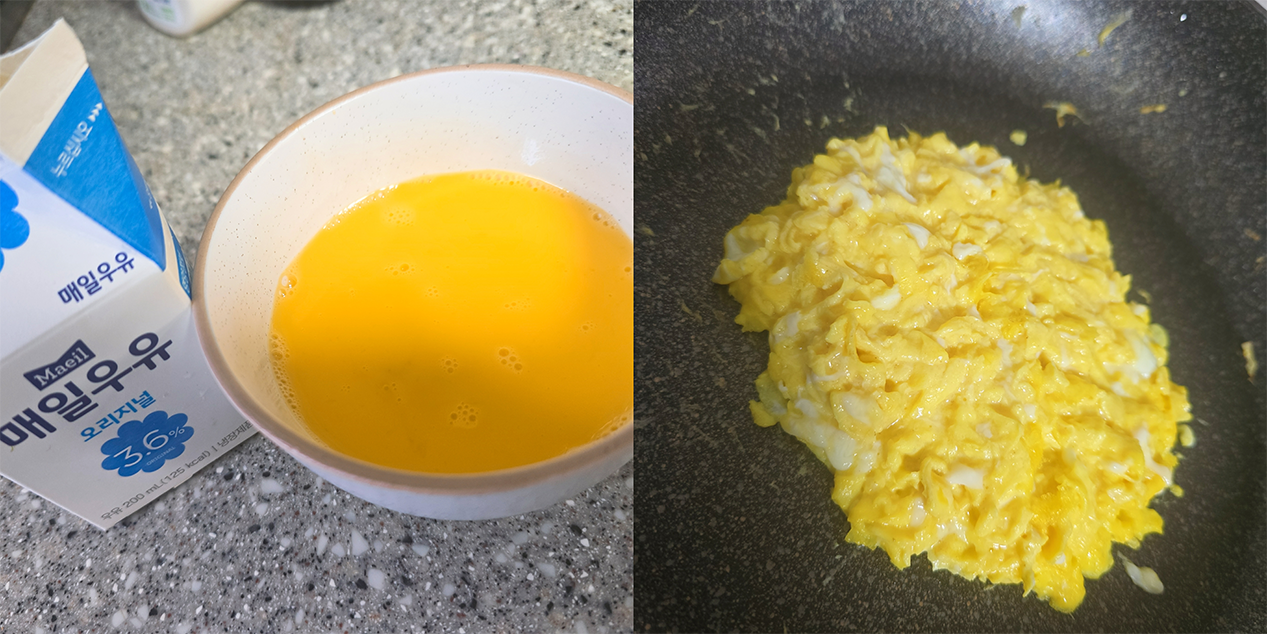 버터를 두른 프라이팬에서 약불로 천천히 익히며 스크램블 해줬어요.