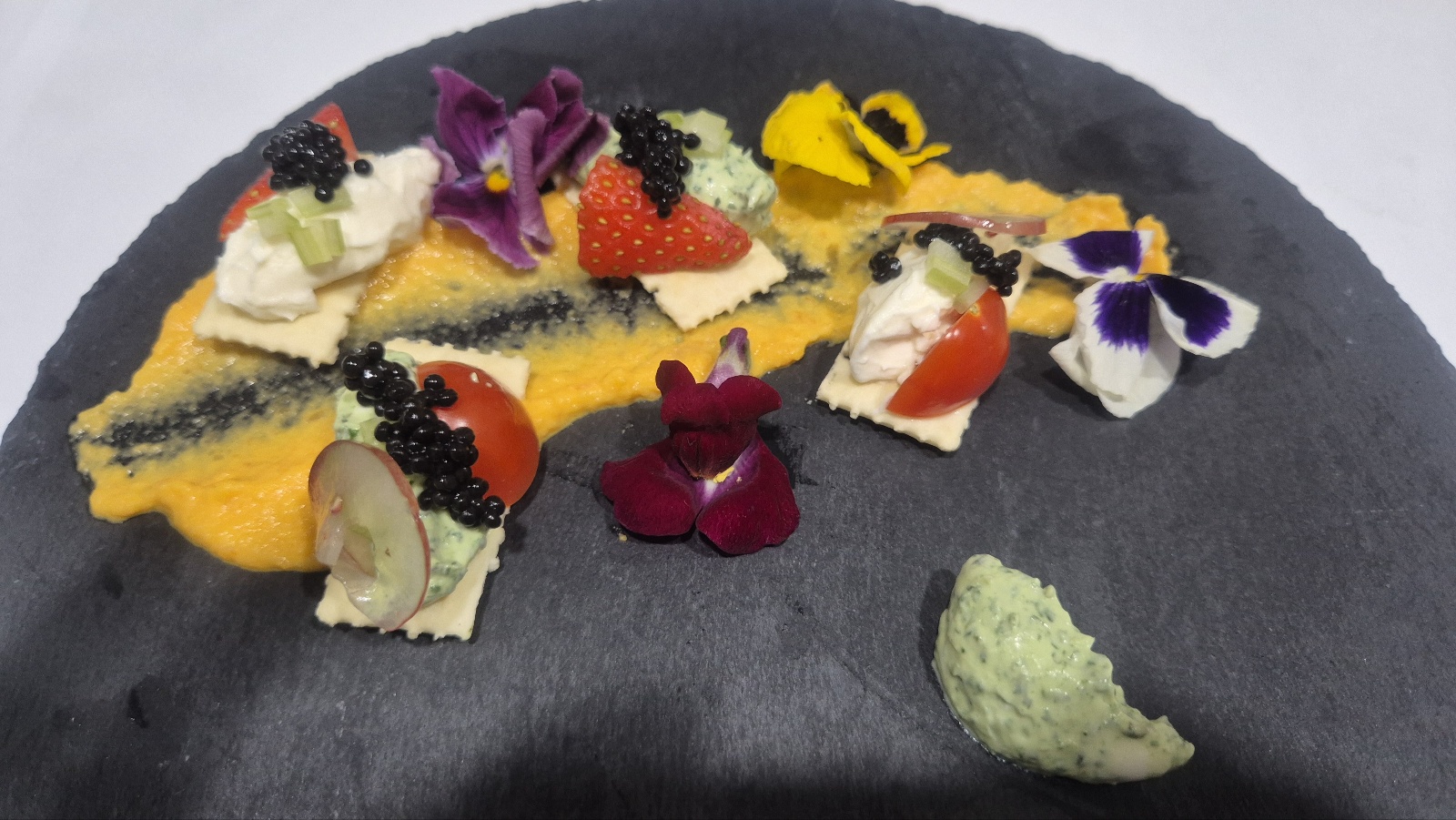 철갑상어=캐비어죠! 네... 비쌉니다..ㅠㅠ 비싼 요리입니다 그냥...비스킷 에다가 크림치즈 그리고 과일로 곁들임해서 먹는 음식입니다. 꽃.... 있어보이잖아요!? 꽃하니 한분이 생각나긴하는데..... 흠흠 다음으로 넘어가죠!!