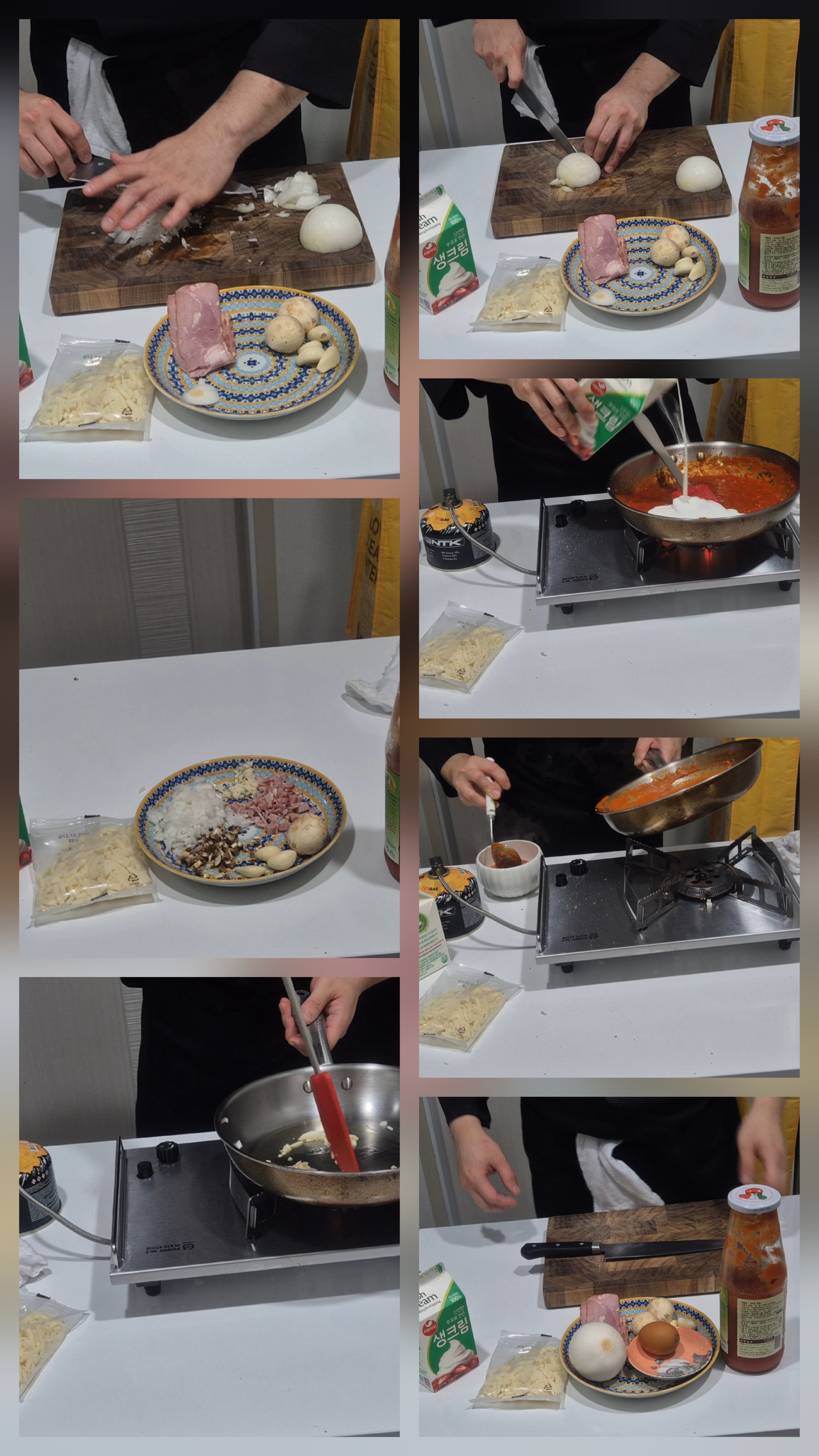 모든 재료를 향과 기름을 빼주고 부드럽게 생크림까지 넣어주었습니다 그릇에 옮긴다음 계란과 모짜치즈를 올리고 토치로 살짝 구워주웠습니다.