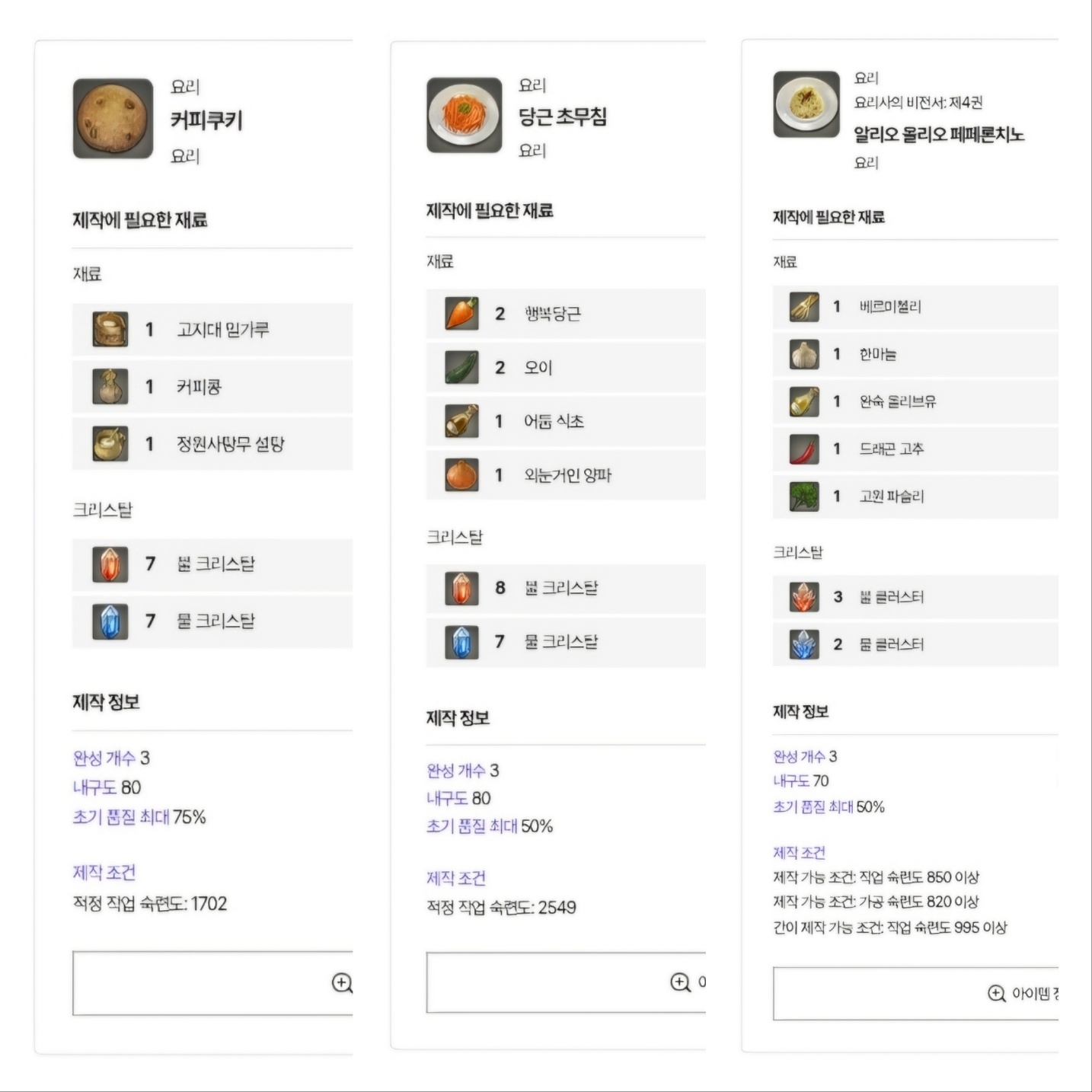 ▼ 인겜 내 레시피입니다. 있는 건 넣고 없는 건 대체해서 간단하게 만들어보겠습니다.