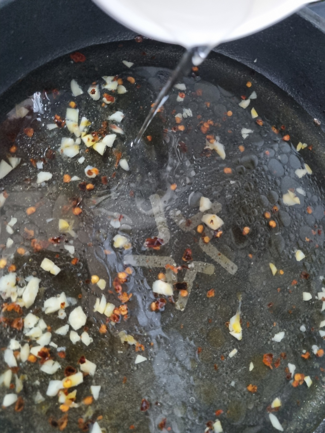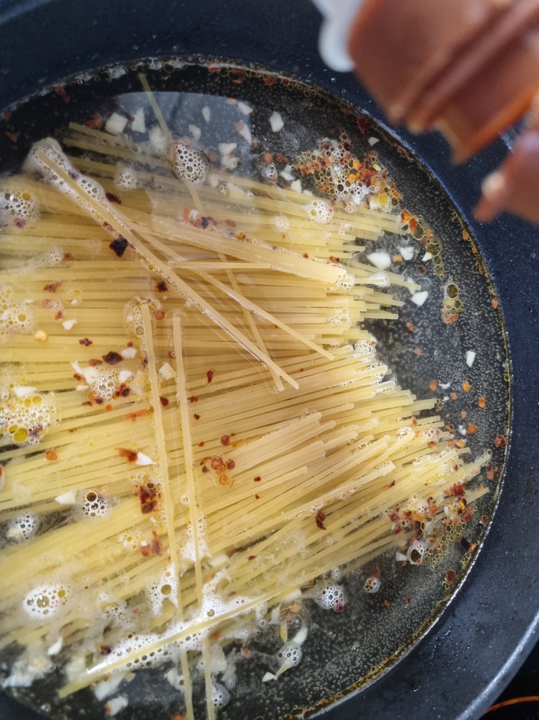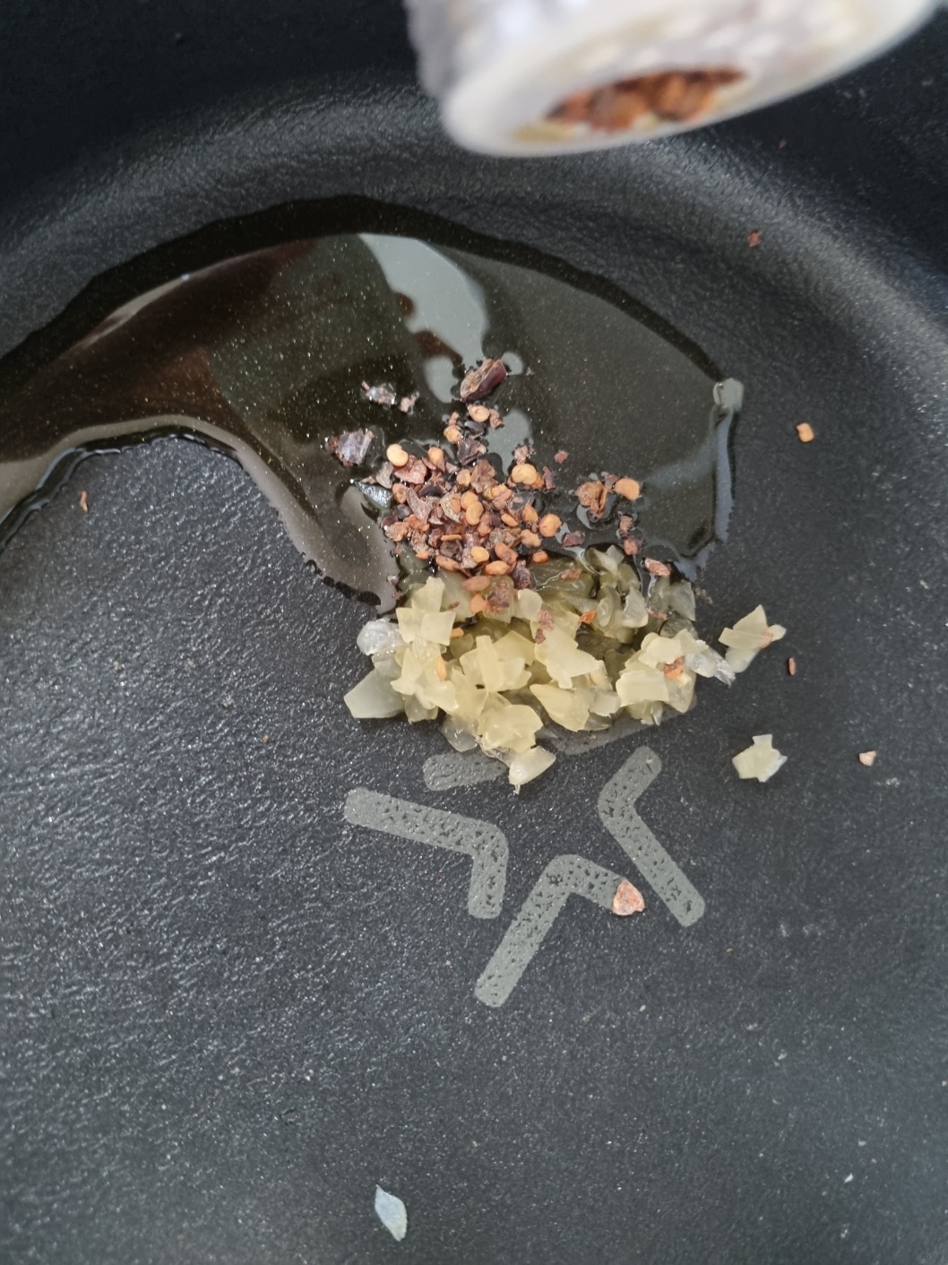 14. 팬에 올리브유, 마늘, 페페론치노를 넣고 기름이 붉은 빛을 띌 때까지 살짝 볶아줍니다.