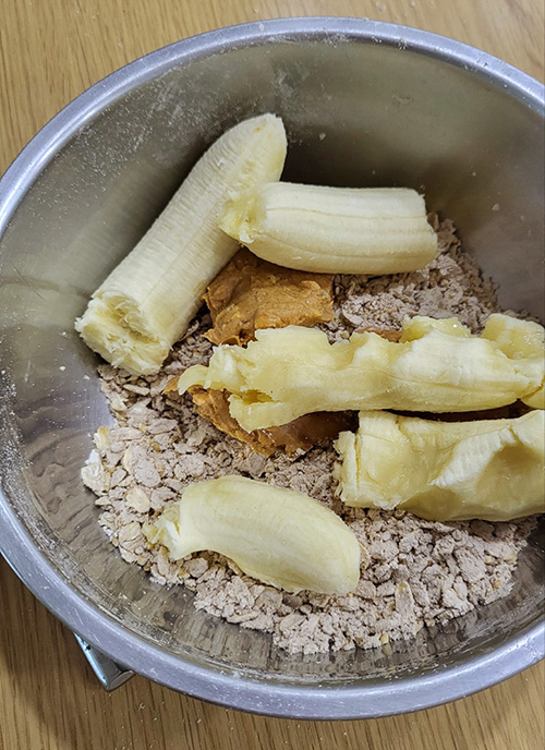 큰 볼에 프로틴 파우더와 귀리를 넣습니다.