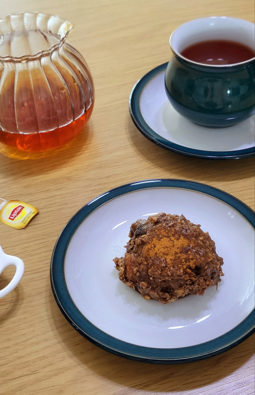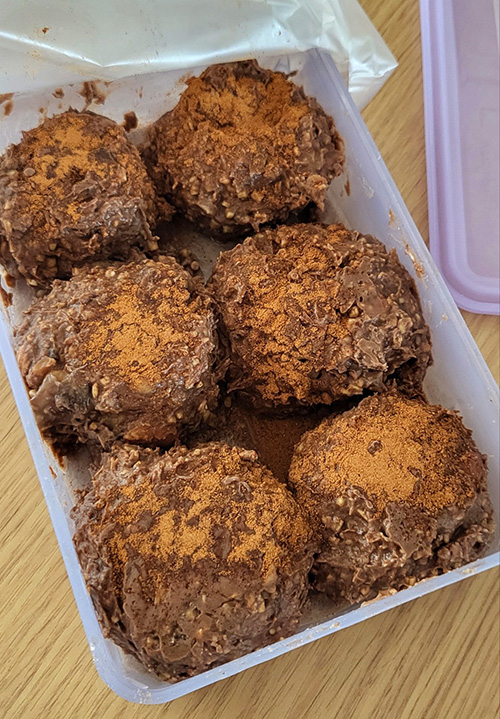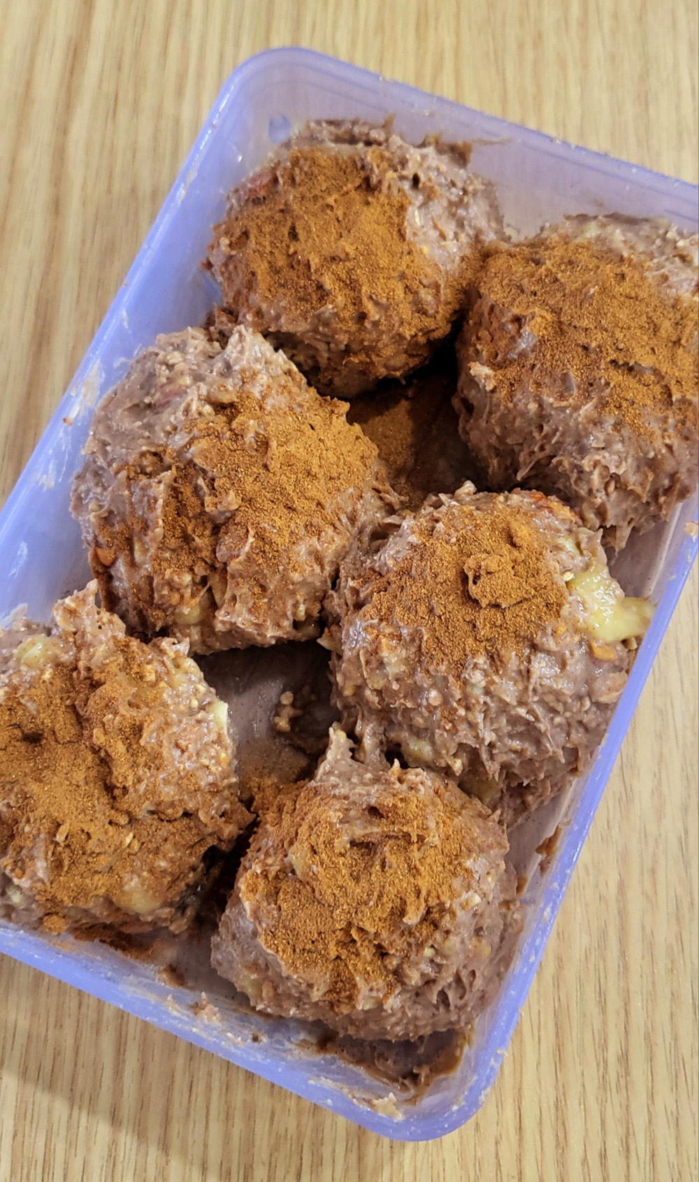 적당히 모양을 잡아서 틀에 보관해줍니다. 한 끼 먹을 분량으로 대충 집어서요. 저는 주먹밥 사이즈 정도면 되지 않을까 생각했어요. 풍미를 위해서 집에 있던 계피 가루를 뿌려줬습니다.