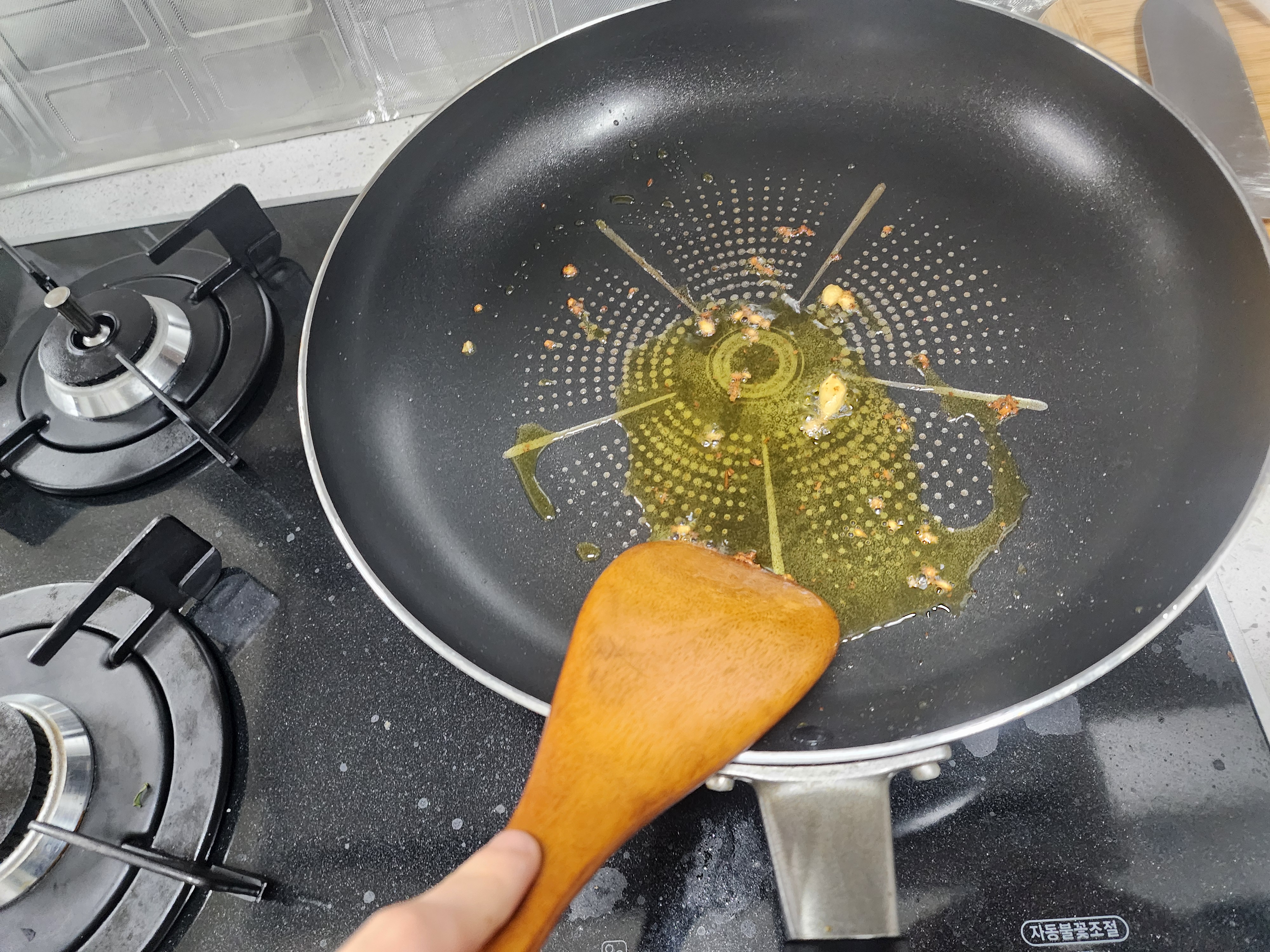 해동을 한 새우를 올리브유에 다진마늘 넣고, 구워줍니다,