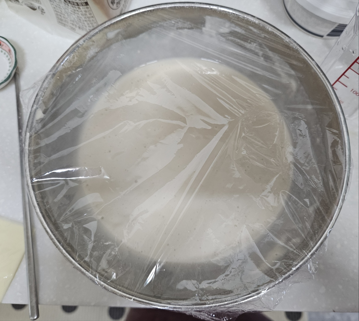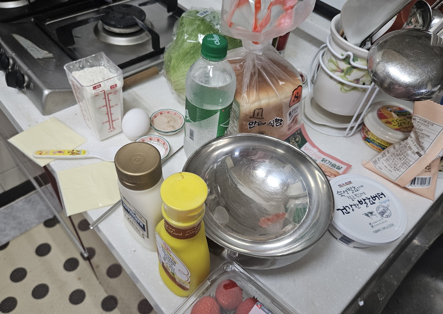 그 후 랩을 씌우고 냉장고에 40분정도 휴지시킵니다. 휴지시킬동안 샌드위치를 만들기 위해 재료를 꺼내옵니다.