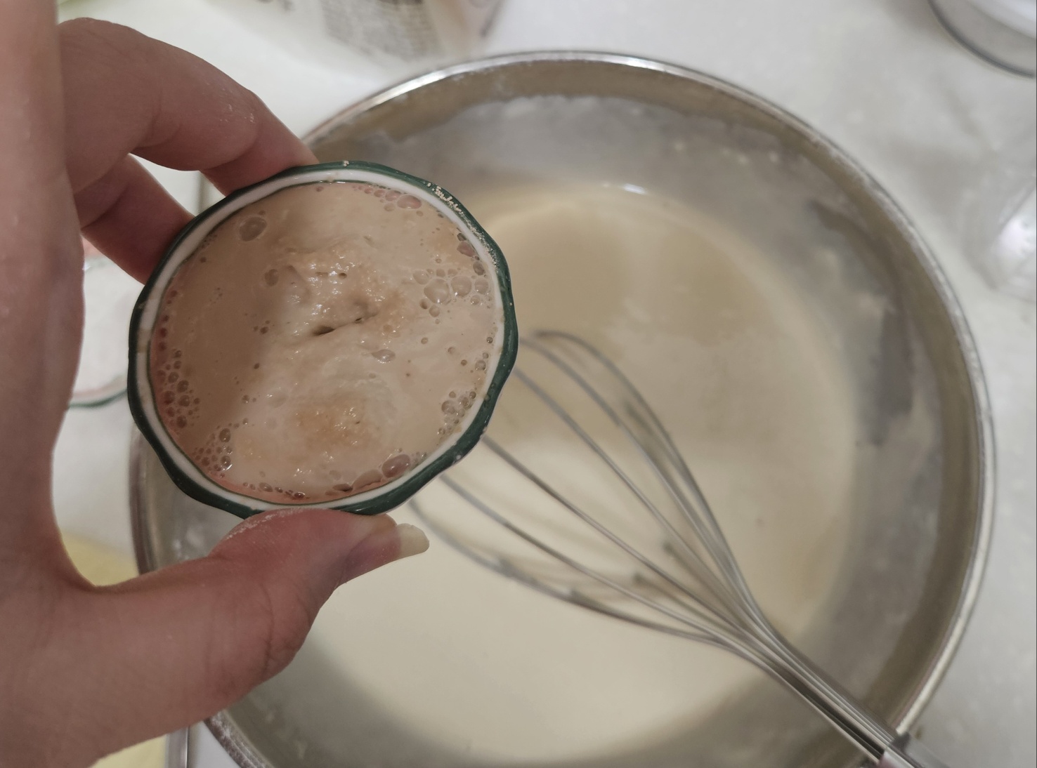 어느정도 섞이면 위의 사진과 같이 드라이 이스트 3g(따듯한물 1티스푼 추가)를 넣고 베이킹파우터 1 티스푼 넣고 열심히 또 젓습니다. 왠만하면 전동 휘핑기를 추천합니다.
