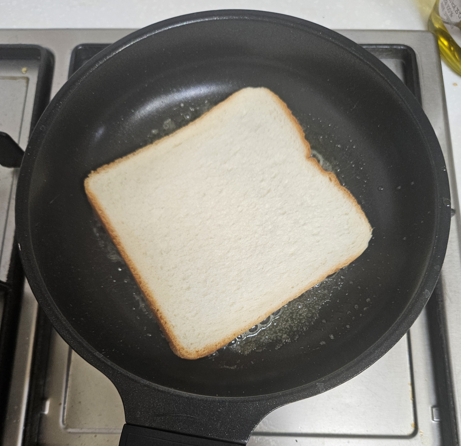 후라이팬에 버터를 두르고 식빵을 위에 올린후 양면을 노릇하게 굽습니다. 이 동작을 4번정도 반복합니다.