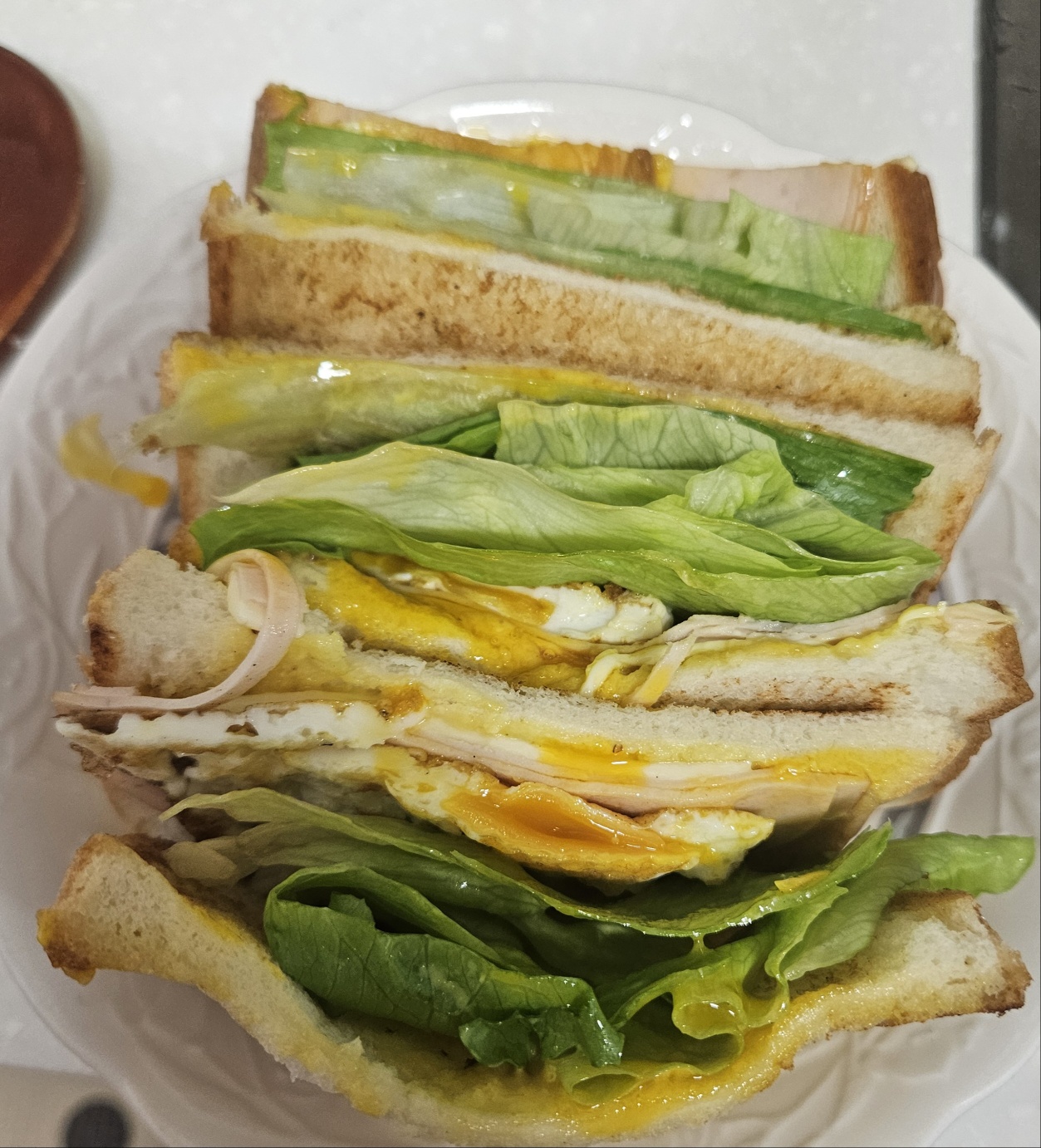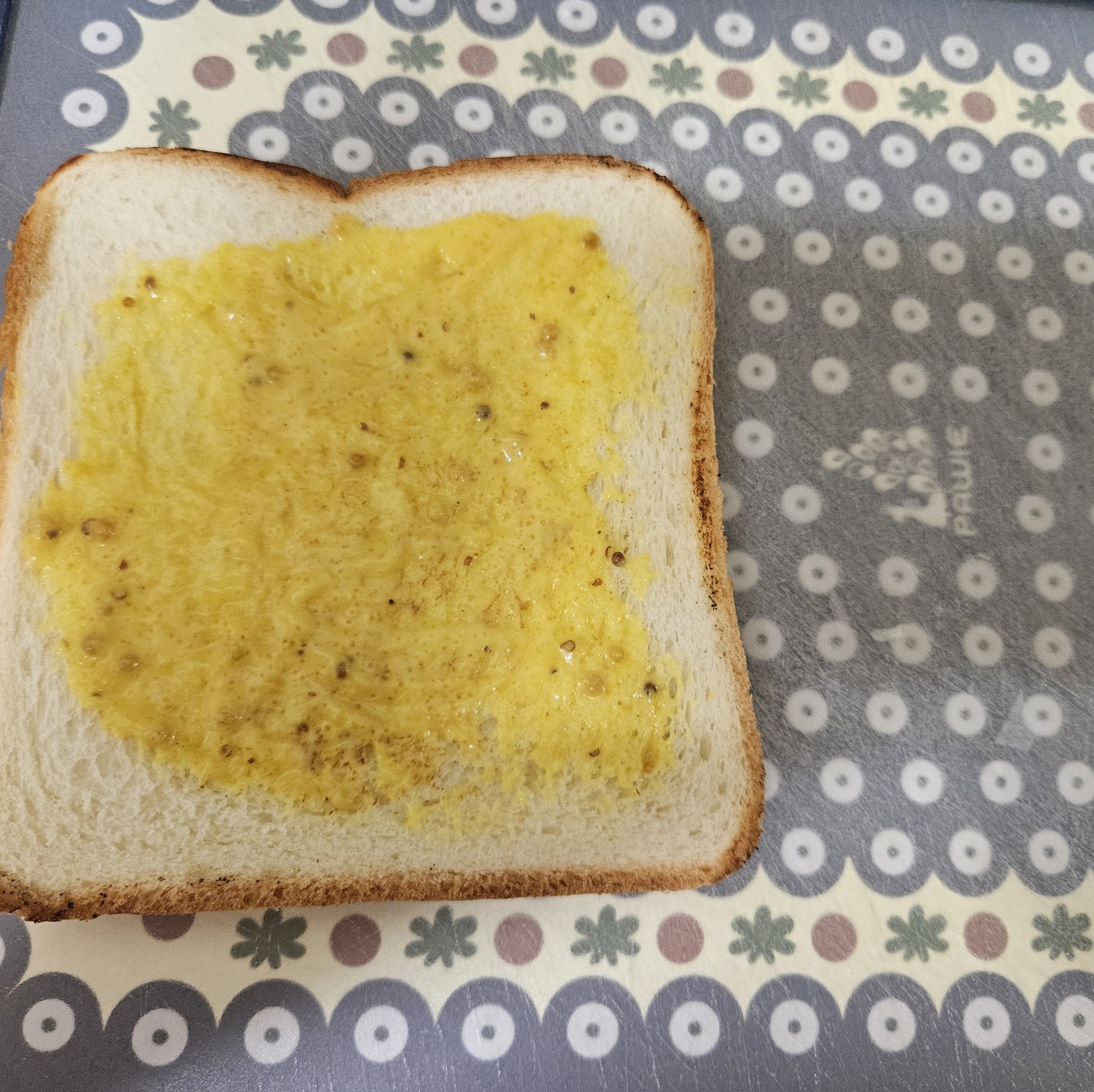 홀 머스타드 소스(홀 머스타드 적당량.설탕 적당량,마요네즈 적당량)을 넣어 젓고 만든 소스를 빵 양쪽에 바르고 치즈 / 햄 두장 / 계란 후라이 1개/ 양상추 적당량/ 빵 을 올려 반으로 잘라 접시에 올려놓습니다