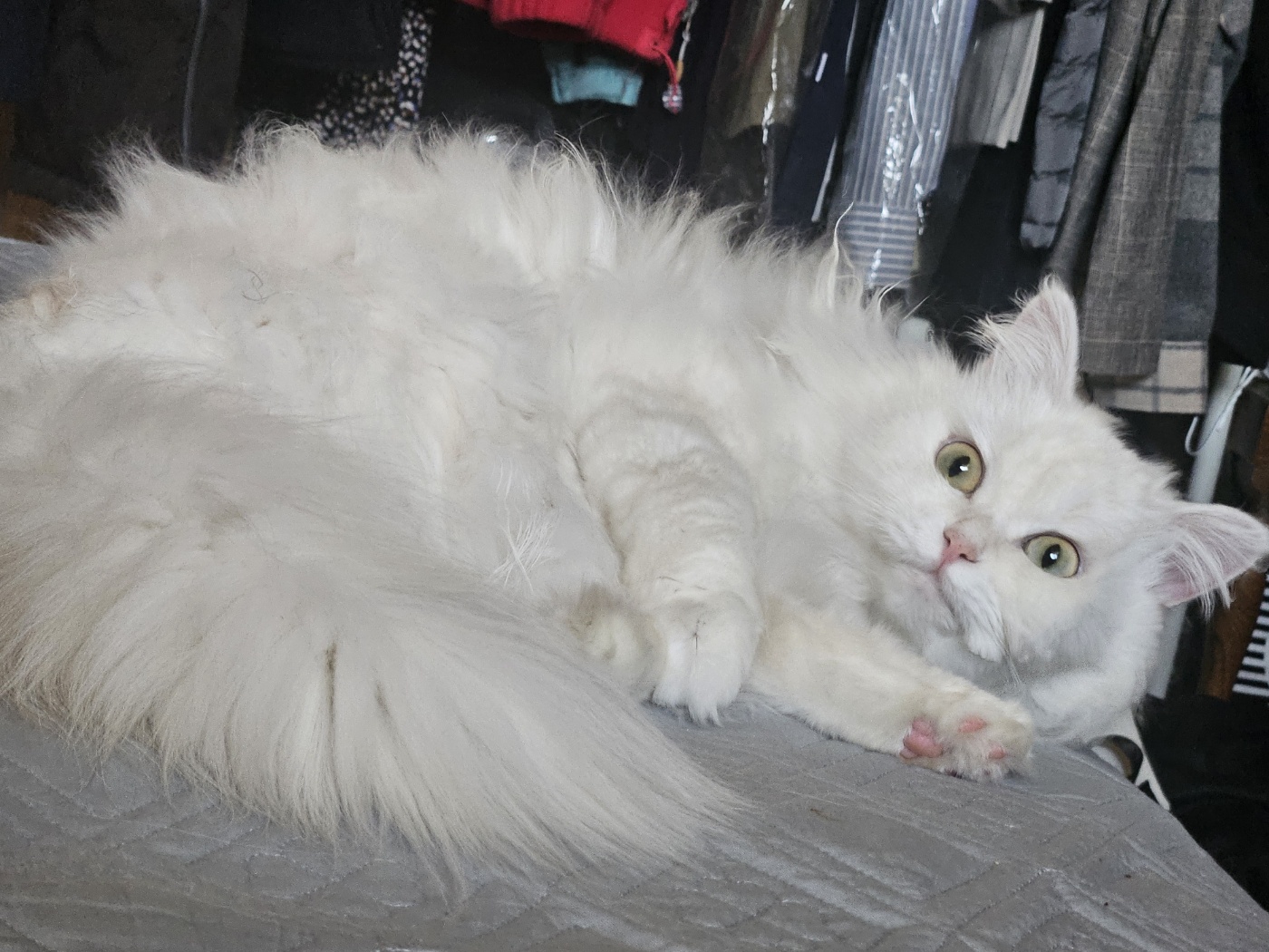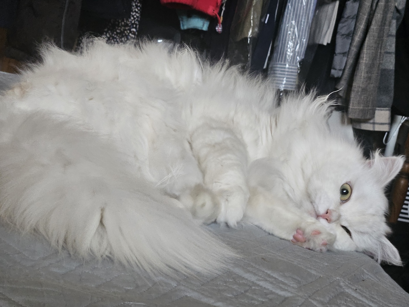 집사가 요리하느라 돌아다닌다고 냉장고를 연 사이 츄르달라고 잠옷을 뜯는 하얀 커얼씨를 방에 데려다 둡니다.
