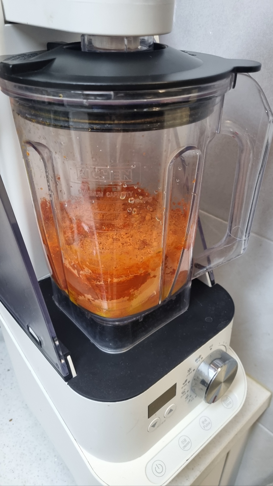 향신료를 액체로 만들기 위해, 또 연육작용과 향을 추가하는 과정을 위해서 오렌지 주스를 넣고 믹서기에 돌려줍니다.