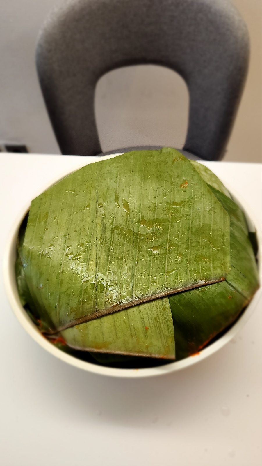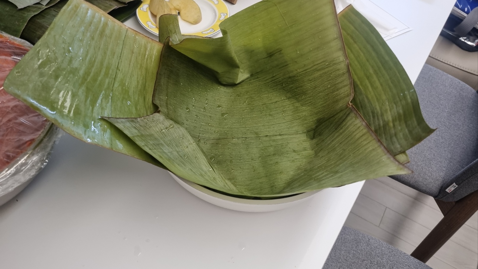 오븐에 들어가기 전에 바나나잎으로 확실히 덮어줍니다.