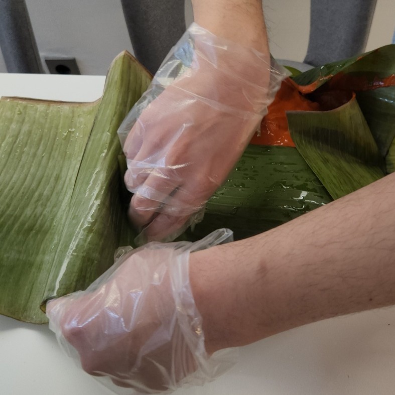 '홍화씨를 비롯한 여러 향신료로 간을 한 돼지고기를 바나나잎으로 감싸 땅속에서 찐 음식이겠군요.' - 쿼나