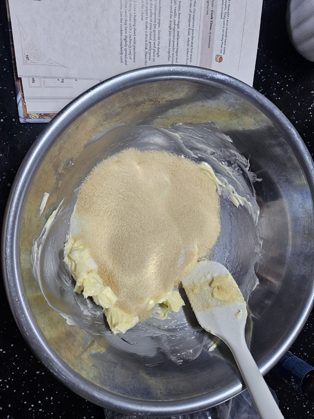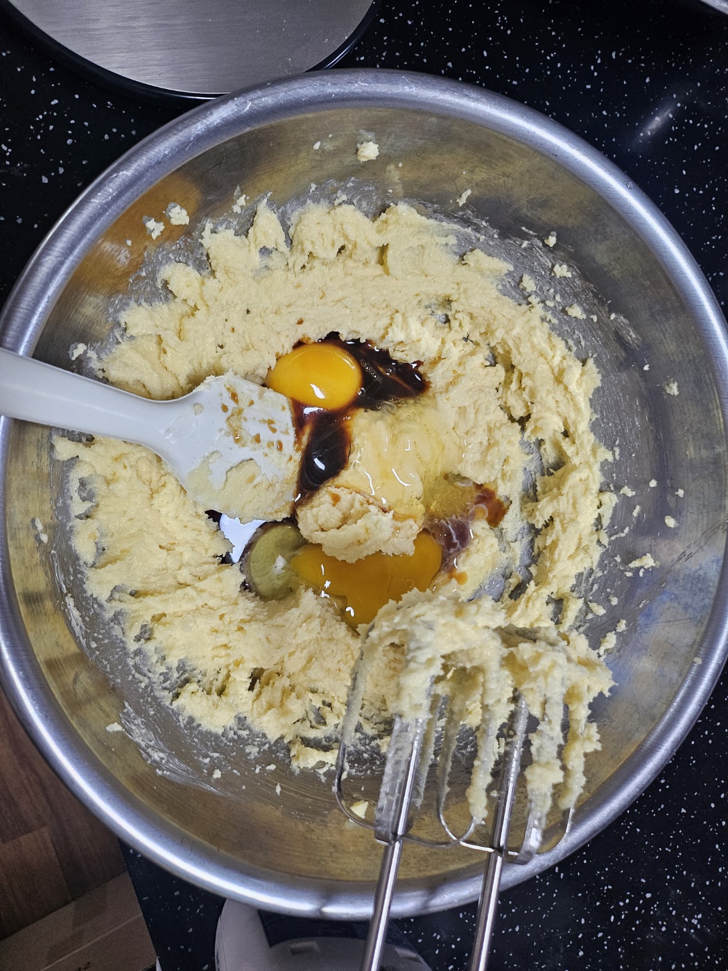 우선 버터를 풀어 크림화해준 다음 설탕 2종을 섞어줍니다