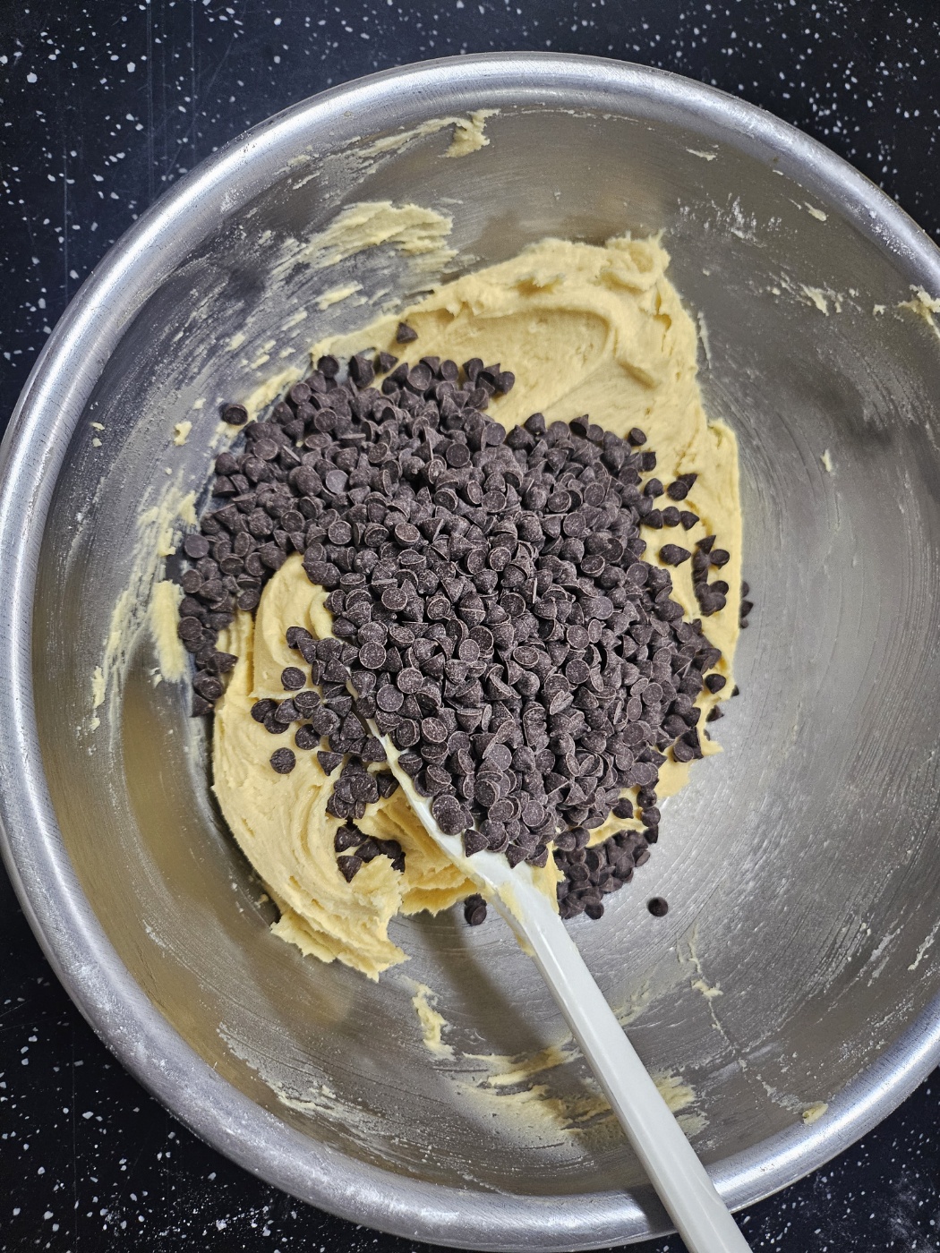 다음으로 밀가루 2종과 베이킹 파우더도 섞어준 뒤 초코칩을 넣어줍니다