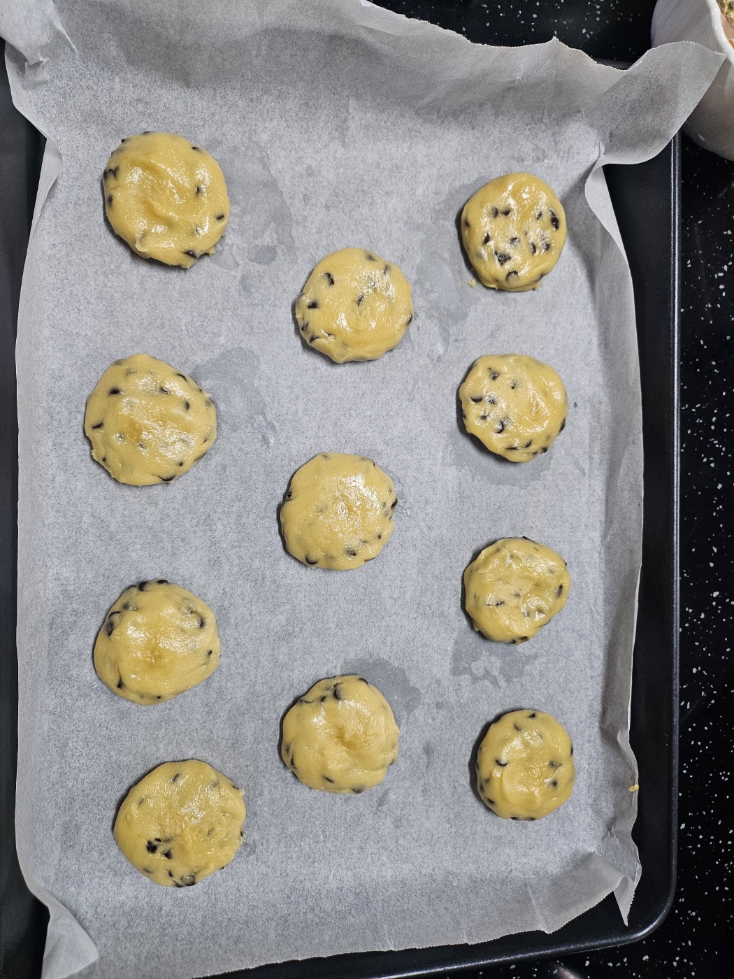 이제 섞인 반죽을 오븐에 팬닝한 뒤 이대로 냉장고에 넣어 1시간 휴지시켜줍니다