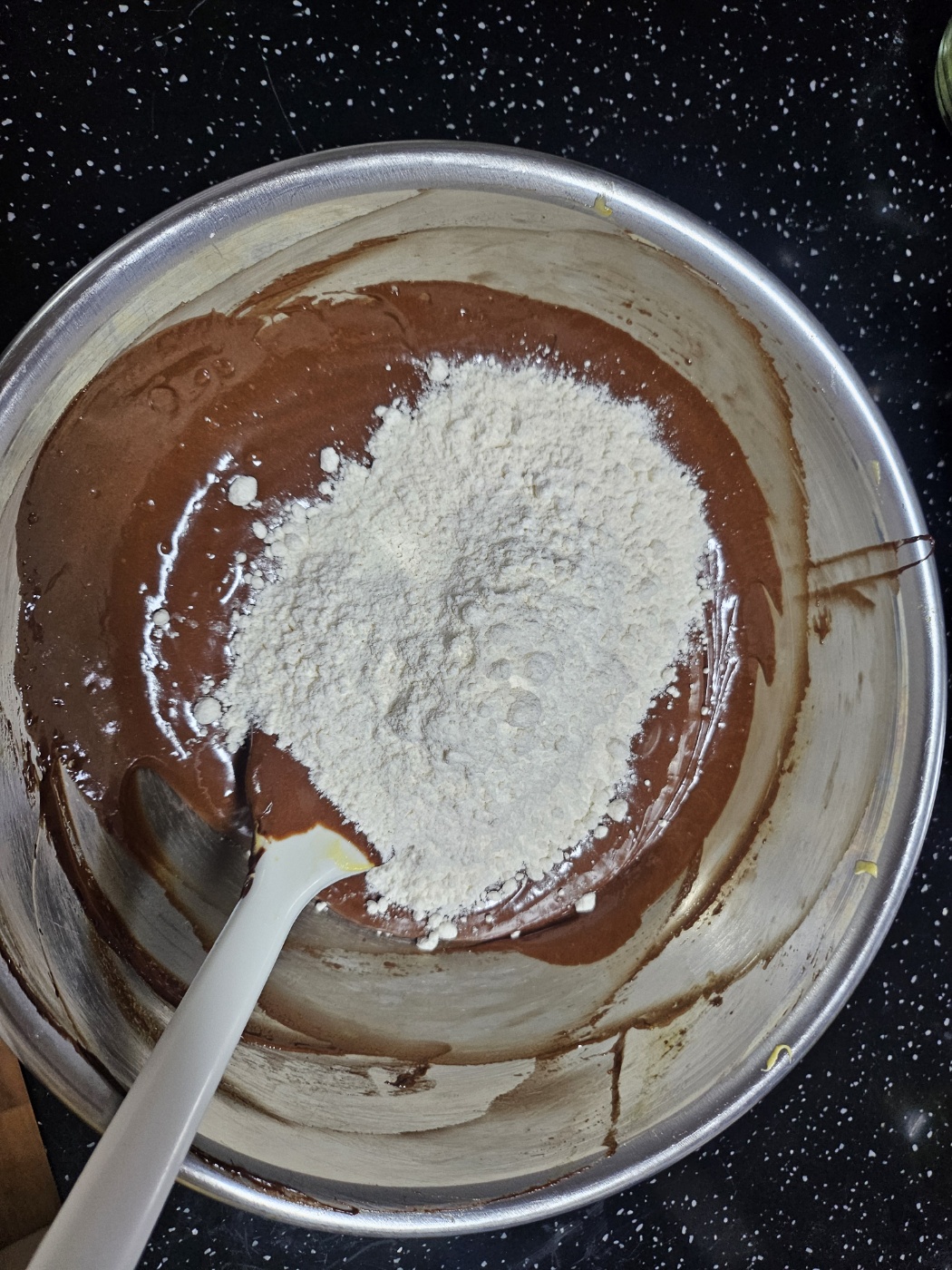 여기에 밀가루 150g을 넣어 잘 섞어주면 초코반죽은 완성