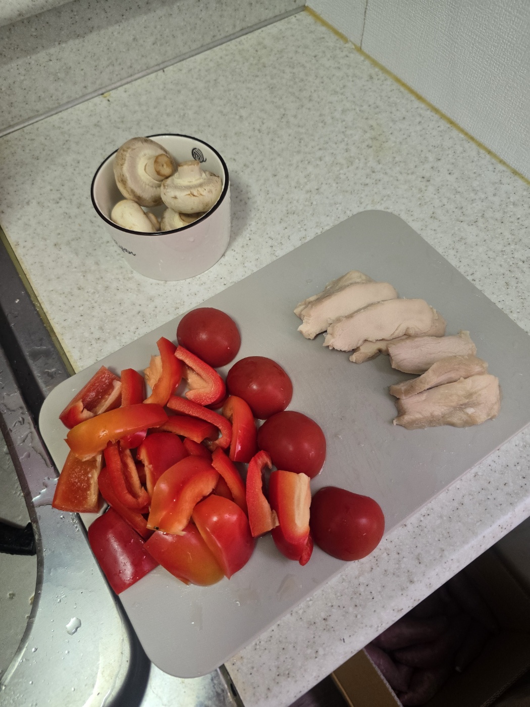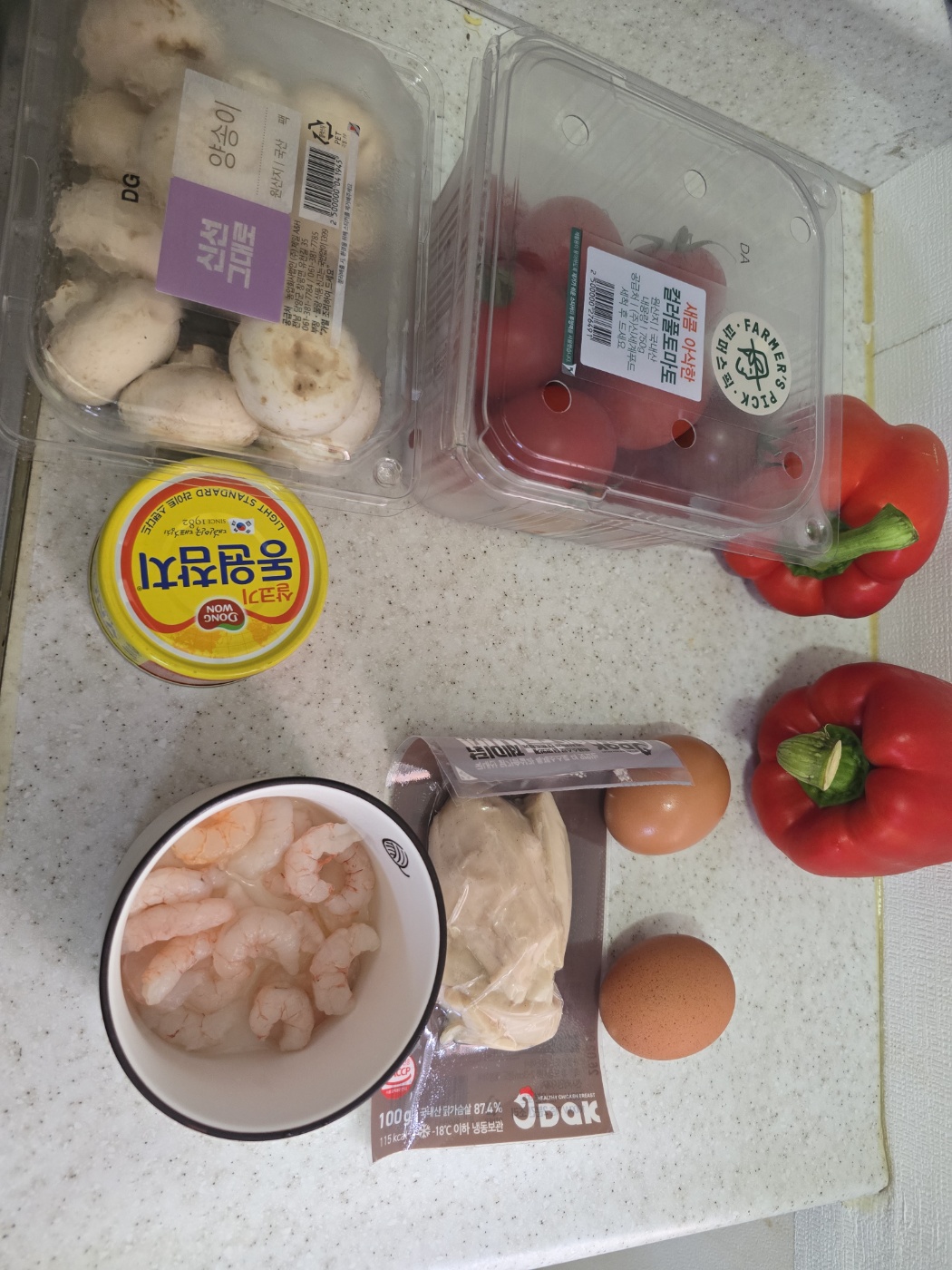 닭가슴살은 이미 슬라이스 된 걸 산 관계로 적당한 크기의 덩어리만 골라내고 작은 건 제 입으로 치우기