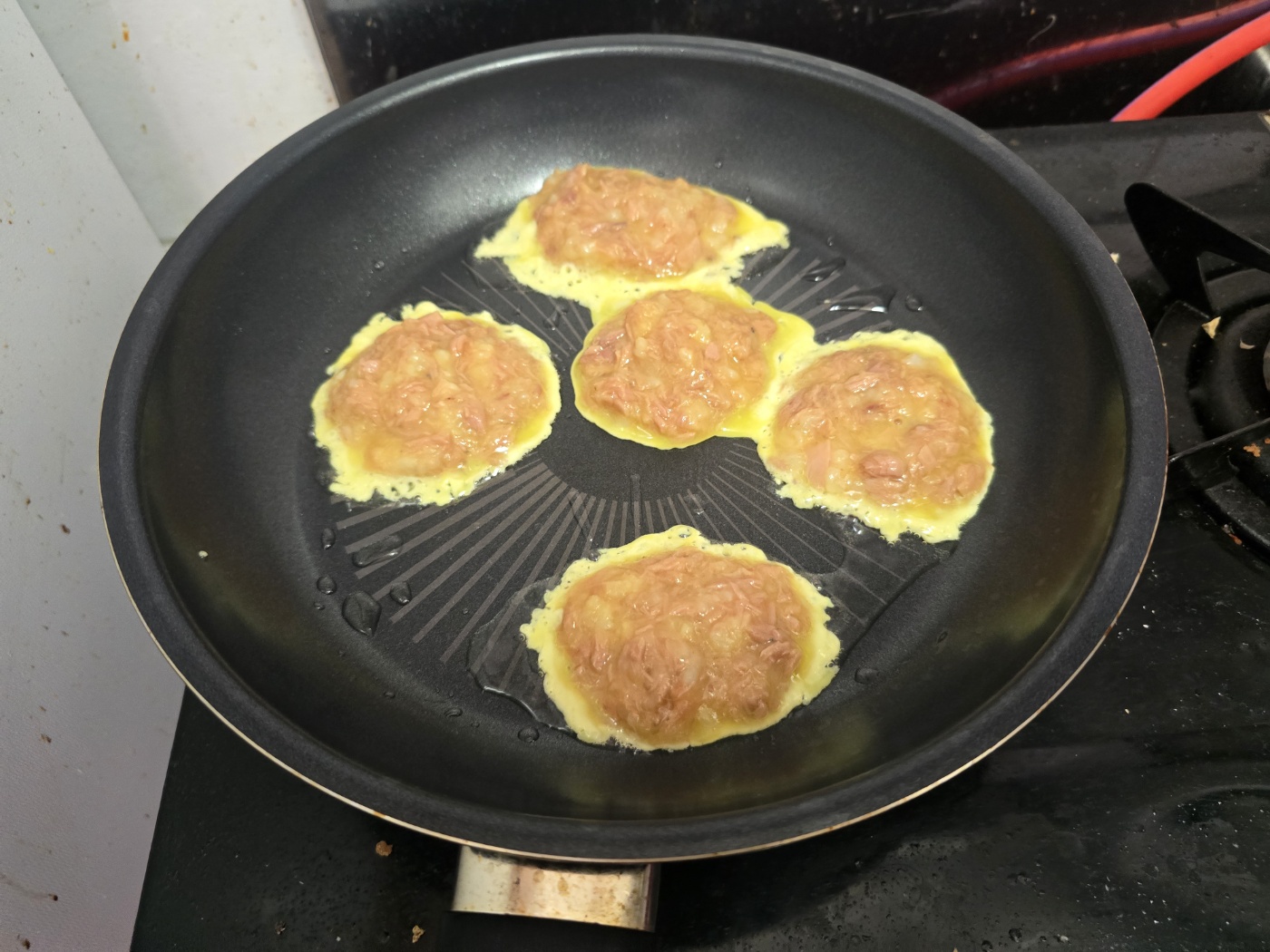 일단 다진 새우, 참치캔, 계란을 섞어서 구워줍니다.