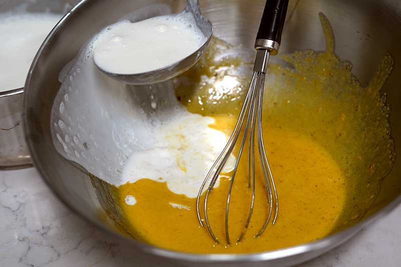 우유가 너무 뜨거우면 계란이 익어서 계란찜이 되어버릴 수 있으니