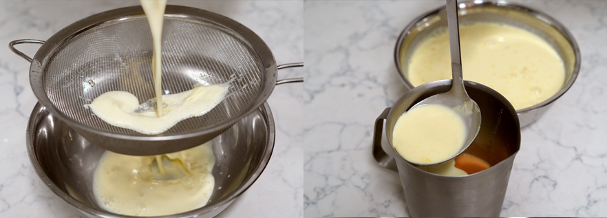 크리미하게 잘 섞인 내용물을 곱게 체에 걸러준 후, 먼저 푸딩의 머리를 작업해둔 틀에!