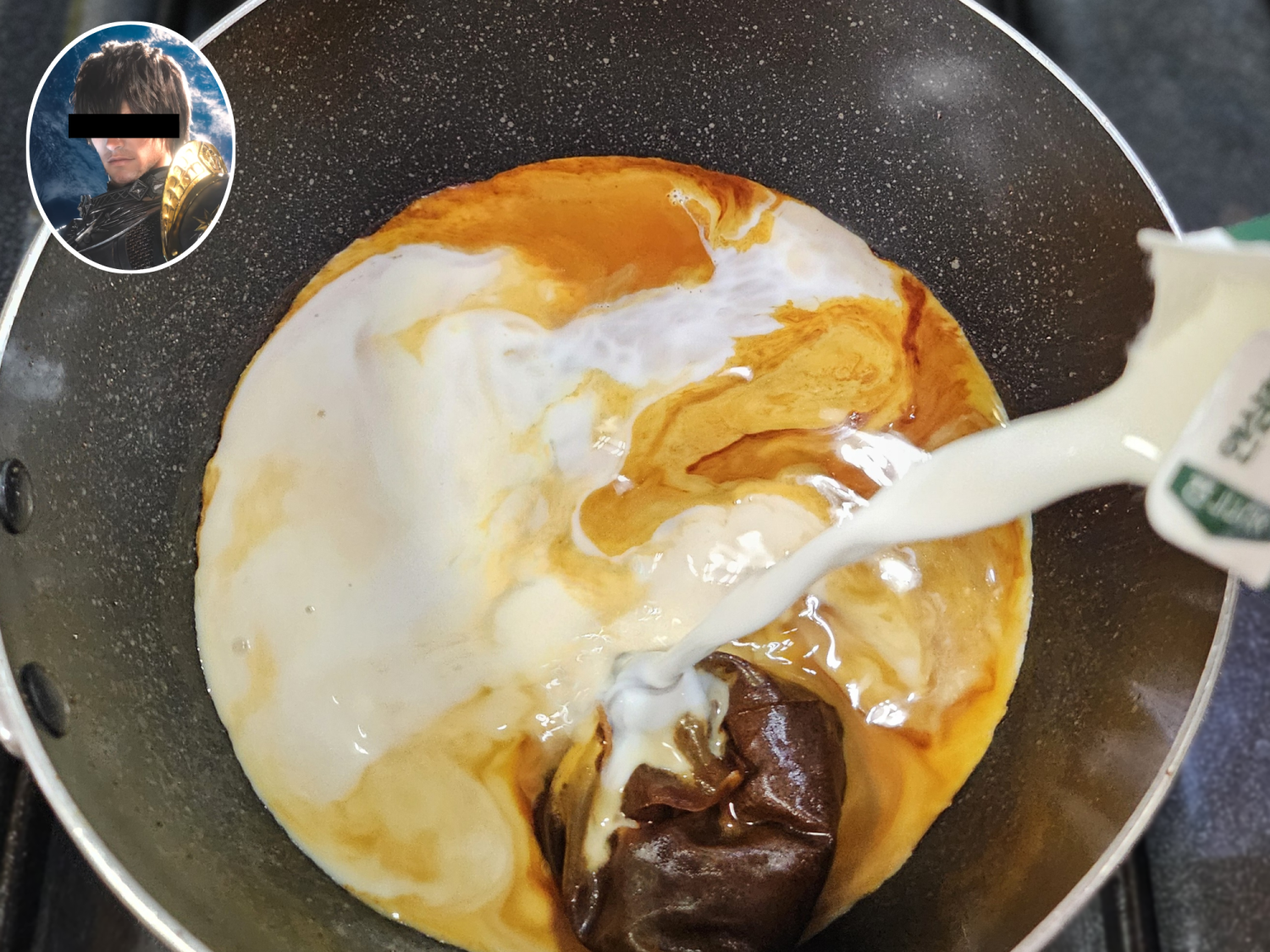적당히 졸아들었다 싶은 타이밍에 우유를 넣습니다!