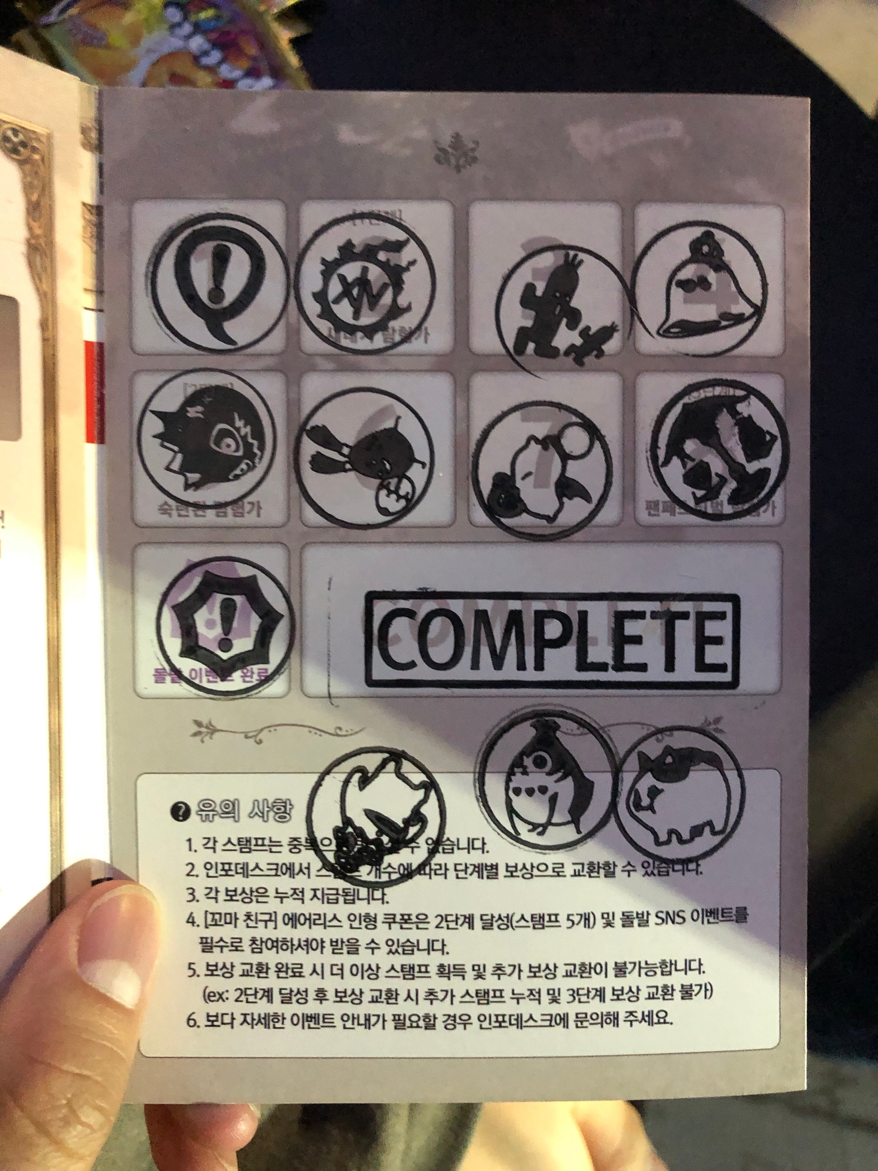 그 뒤로 팬페스 개회 선언식이 이어졌다. 이번 팬페스는 사진은 주로 내 얼굴 사진 위주로 찍고, 행사장을 기록하기 위한 사진은 별로 안 찍어서 (특히 공연들은 더더욱) 뭔가 후기에 올릴만한 사진은 없다. 대신 액티비티를 열심히 했다는 증거로 스탬프 종이를 찎어둔 것은 남아있다. 액티비티는 첫 날에 사람이 너무 많아 기본 20분 이상은 기다렸는데, 둘쨋날에는 첫날에 다 해치운 분들이 늦게 입장하셔서 편하게 도장을 찍을 수 있었다.