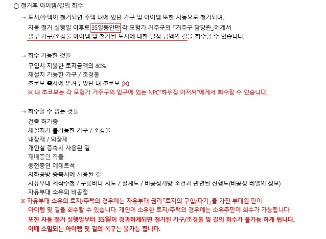 위에 내용은 3.1 패치내용으로 하우징철거에 대한 가장 자세한 내용입니다. 가이드에도 철거관련 내용은 없더라구요.