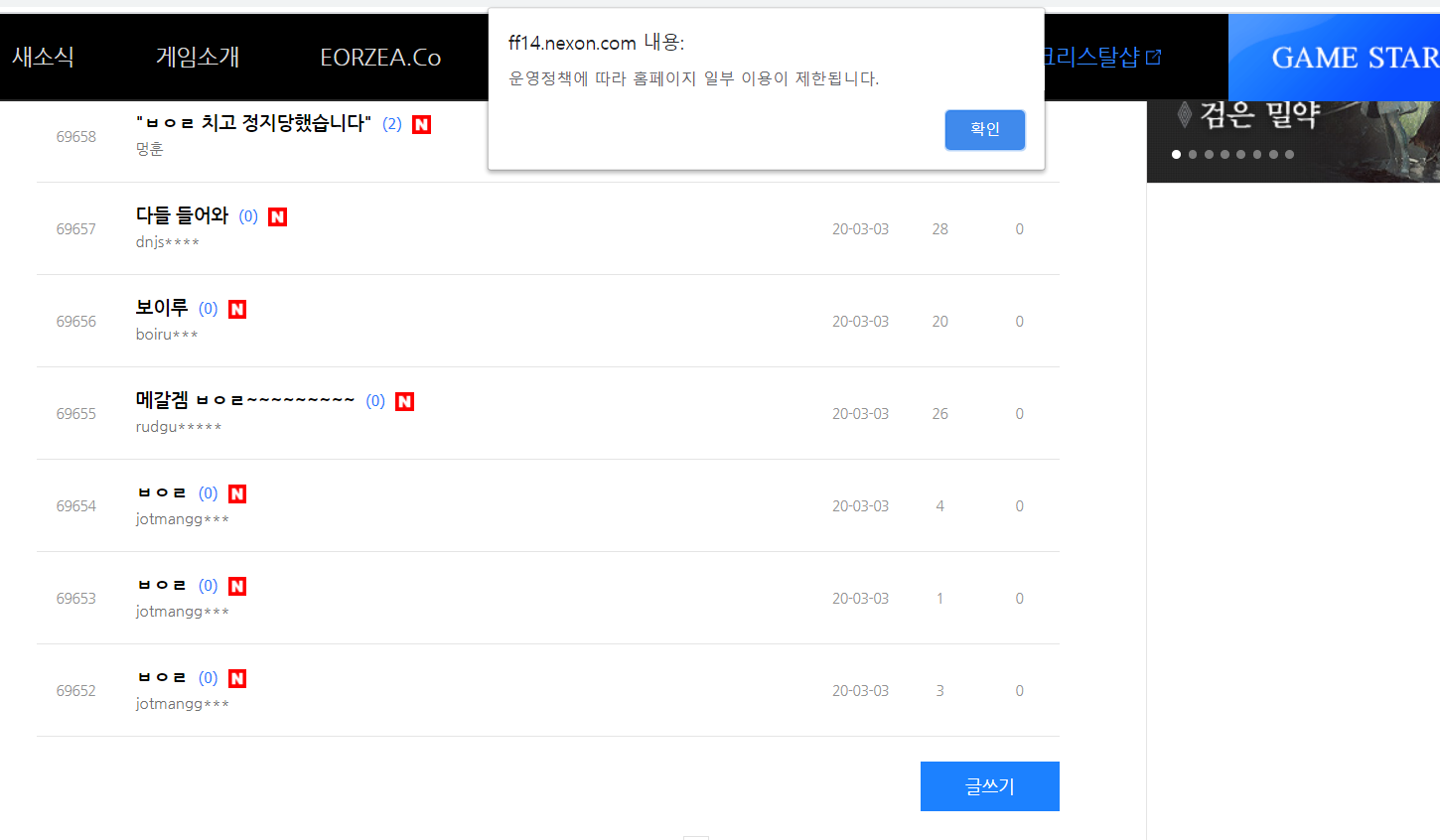 | 69658 | "ㅂㅇㄹ 치고 정지당했습니다" (4) 멍훈 | 20-03-03 | 3061 | 0 |