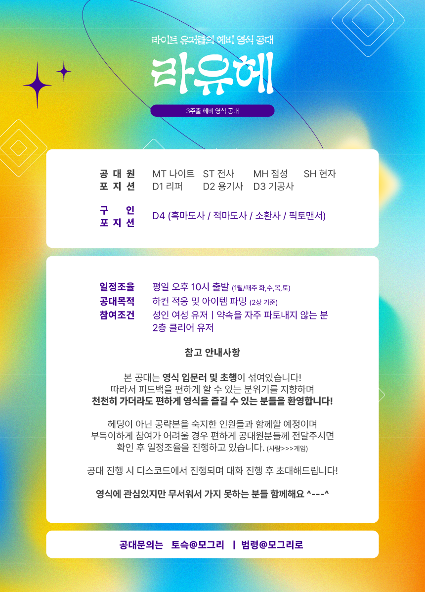 안녕하세요, 메테온@모그리입니다. 제가 부득이하게 공대 참여가 어려워져 공대 대타 인원을 구합니다.