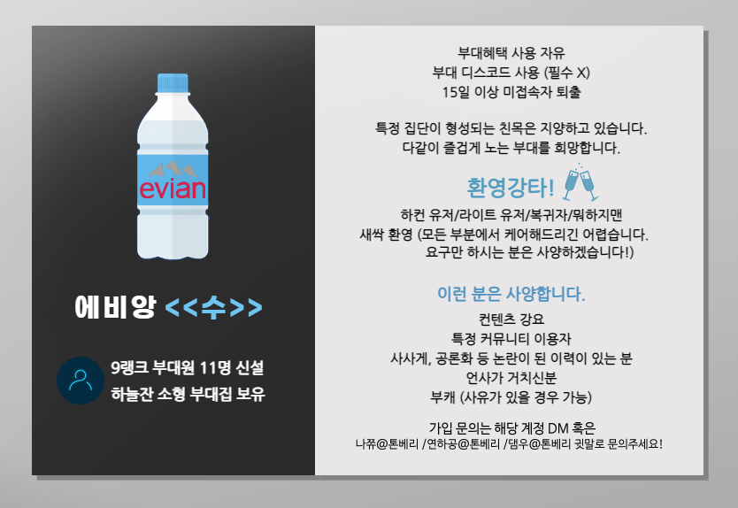 | 10349 | [톤베리] 자유부대 에비앙 ≪수≫ 에서 부대원을 모집합니다. (0) Picture 나쮸 | 21-02-03 | 8088 | 0 |