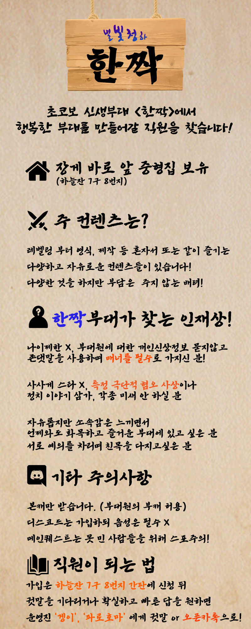 | 16073 | 별빛 주점 <한짝> 에서 새 직원을 구인합니다★ (2) Picture 겡이 | 23-07-11 | 6529 | 0 |