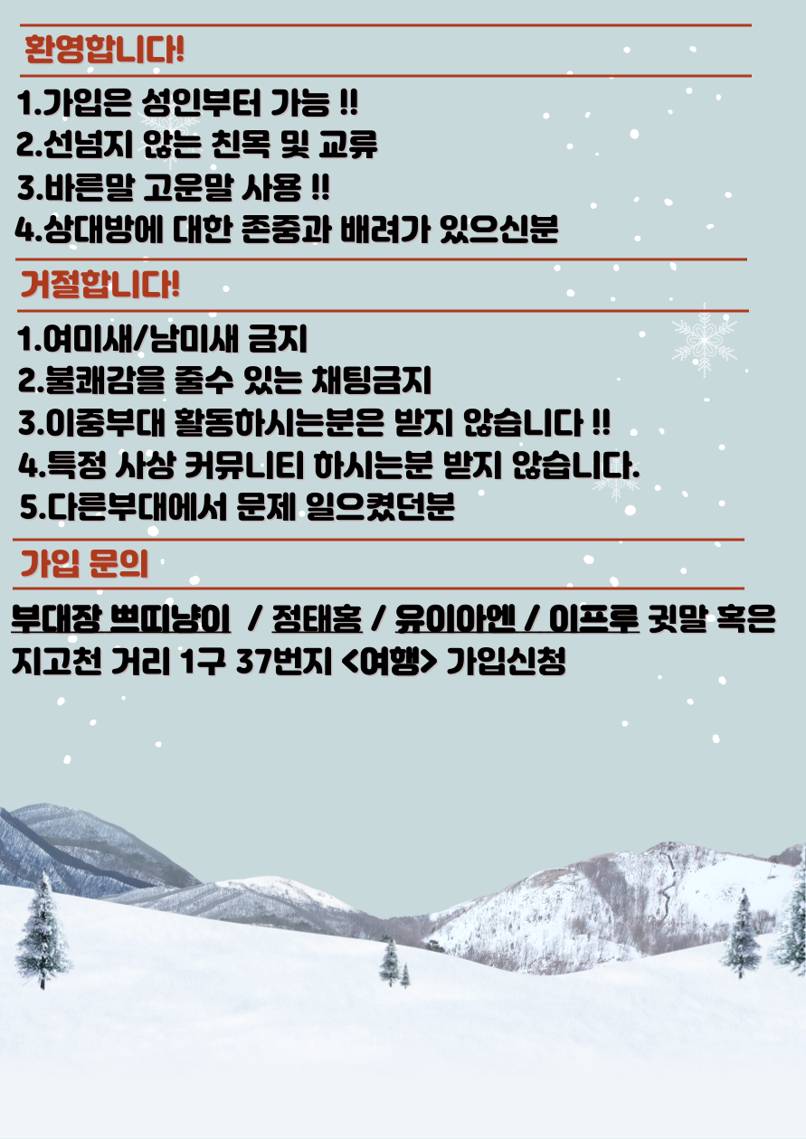 | 20867 | [펜리르] 샛별<<별빛>>부대에서 부대원을 모집중입니다 ~* (0) Picture mose*** | 25-11-26 | 698 | 0 |