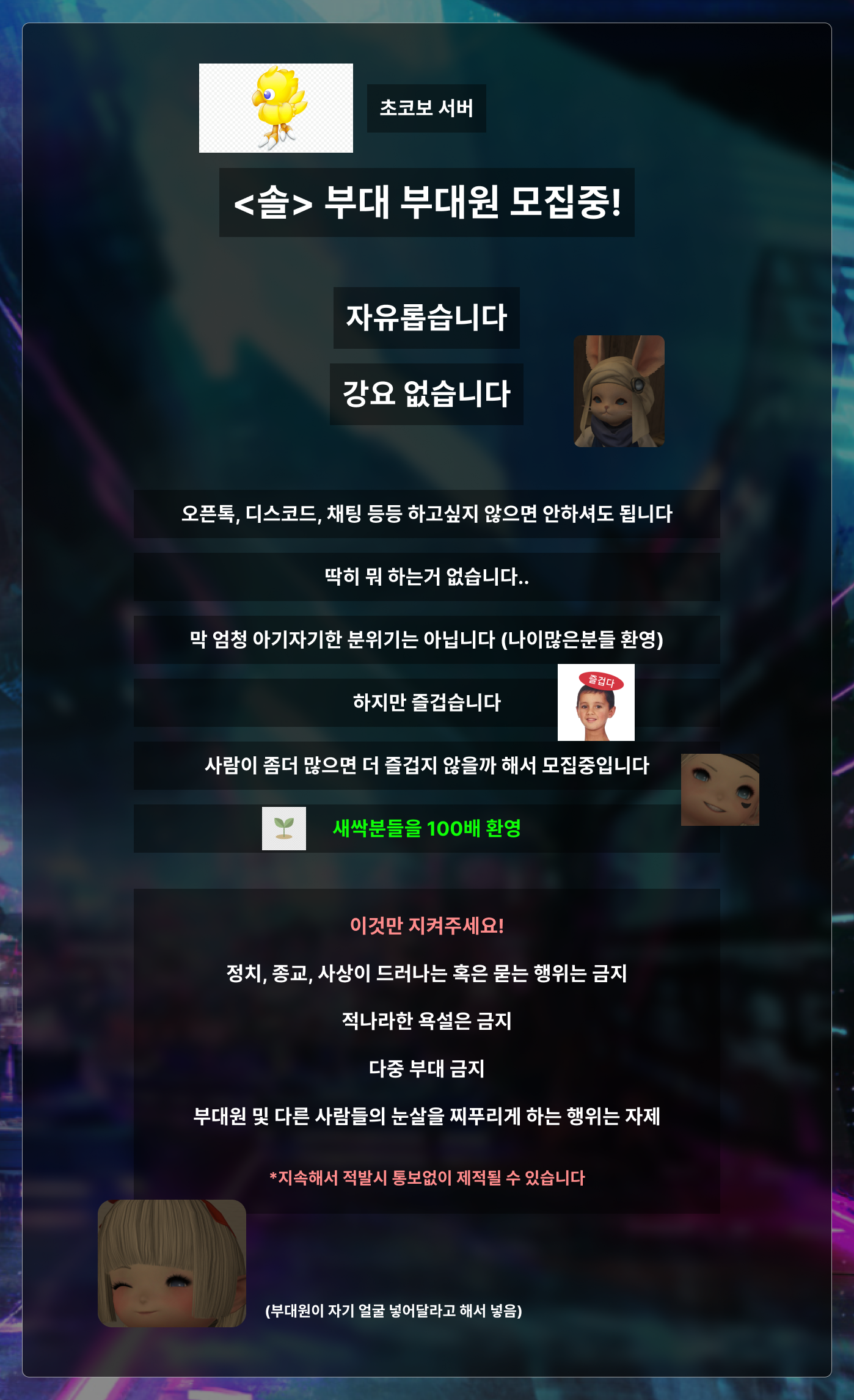 | 18628 | [초코보] <솔> 부대 모집중입니다! :) (0) Picture 보스 | 25-01-01 | 3648 | 0 |