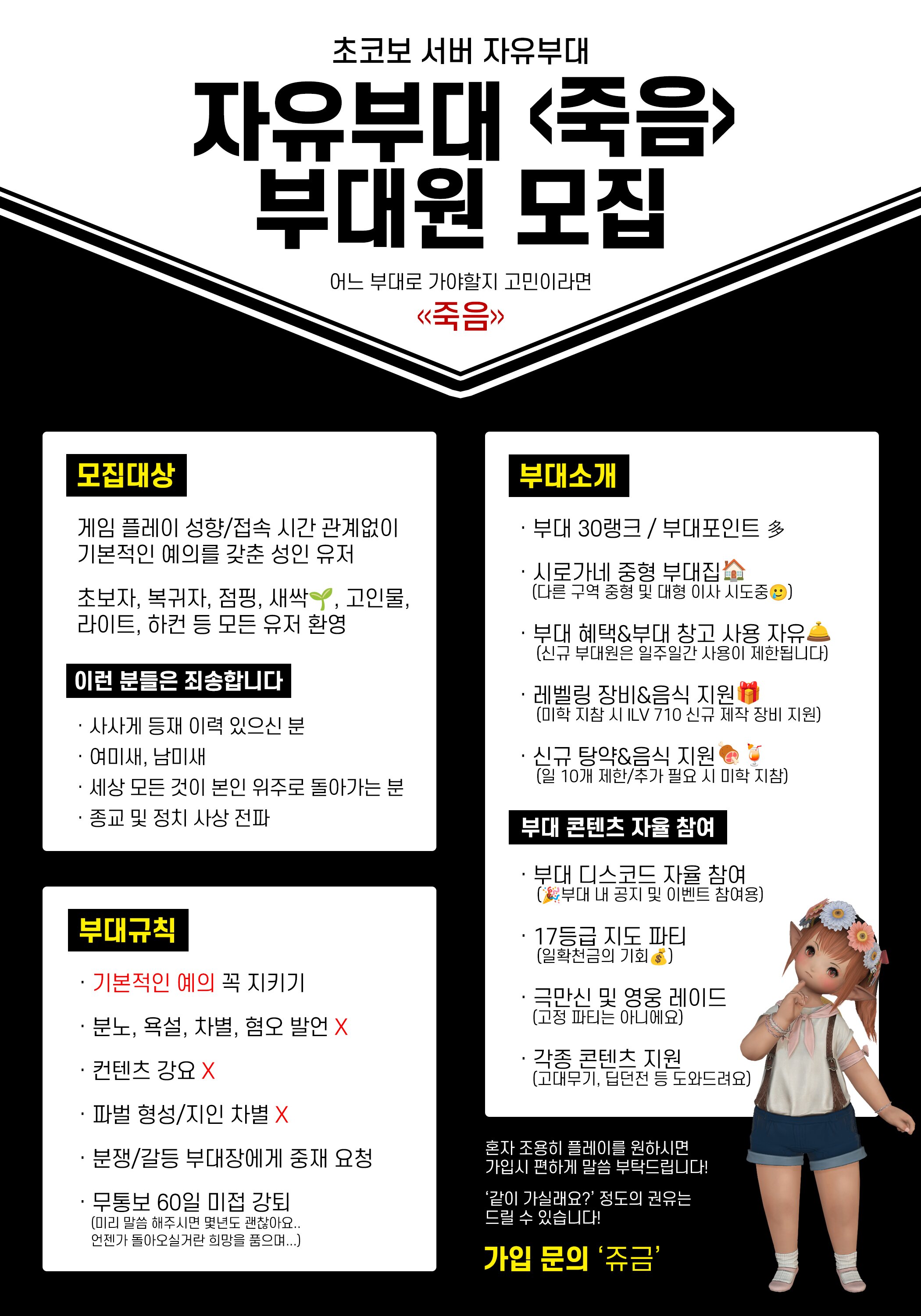 | 19069 | [초코보] 자유부대 ≪죽음≫에서 함께할 부대원을 모집합니다! (0) Picture 쥬금 | 25-02-19 | 3000 | 0 |