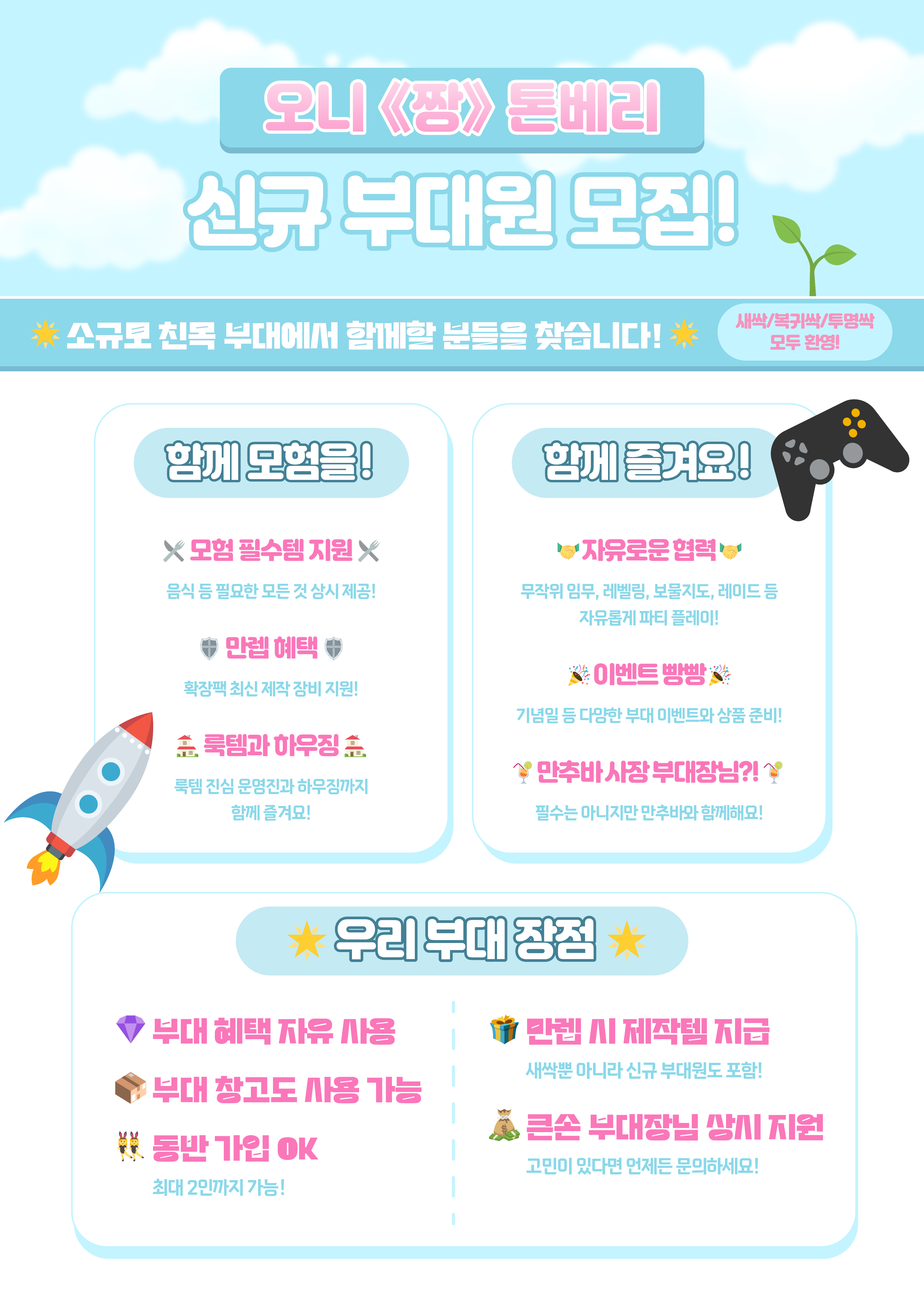 | 19089 | [톤베리] 성인친목부대 팡팡유치원《반》에서 부대원을 모집합니다! (0) Picture 차롱 | 25-02-22 | 3093 | 0 |