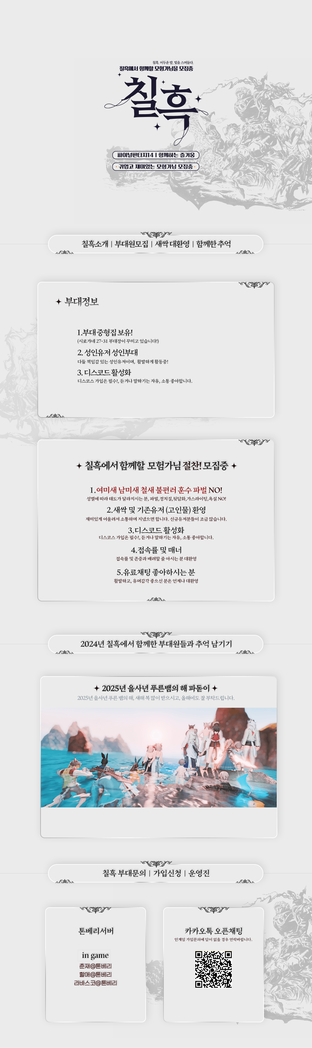 | 19097 | [톤베리] 칠흑의 반역자 <칠흑> 부대에서 왁자지껄 부대원 모집합니다. (0) Picture rpdlxm123@naver.*** | 25-02-23 | 2214 | 0 |