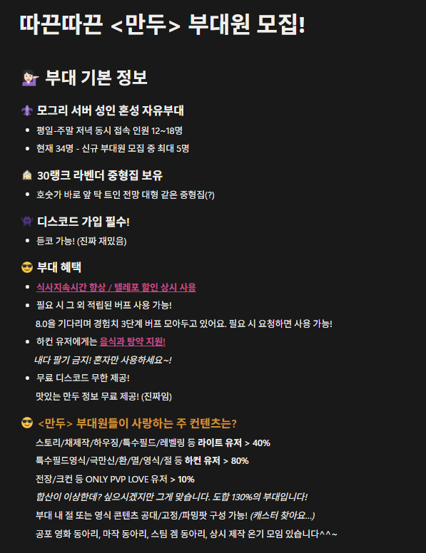 | 21498 | [펜리르]서버 <<편안>>부대 부대원 모집중입니다~ (1) New 페넬 | 26-03-14 | 92 | 0 |