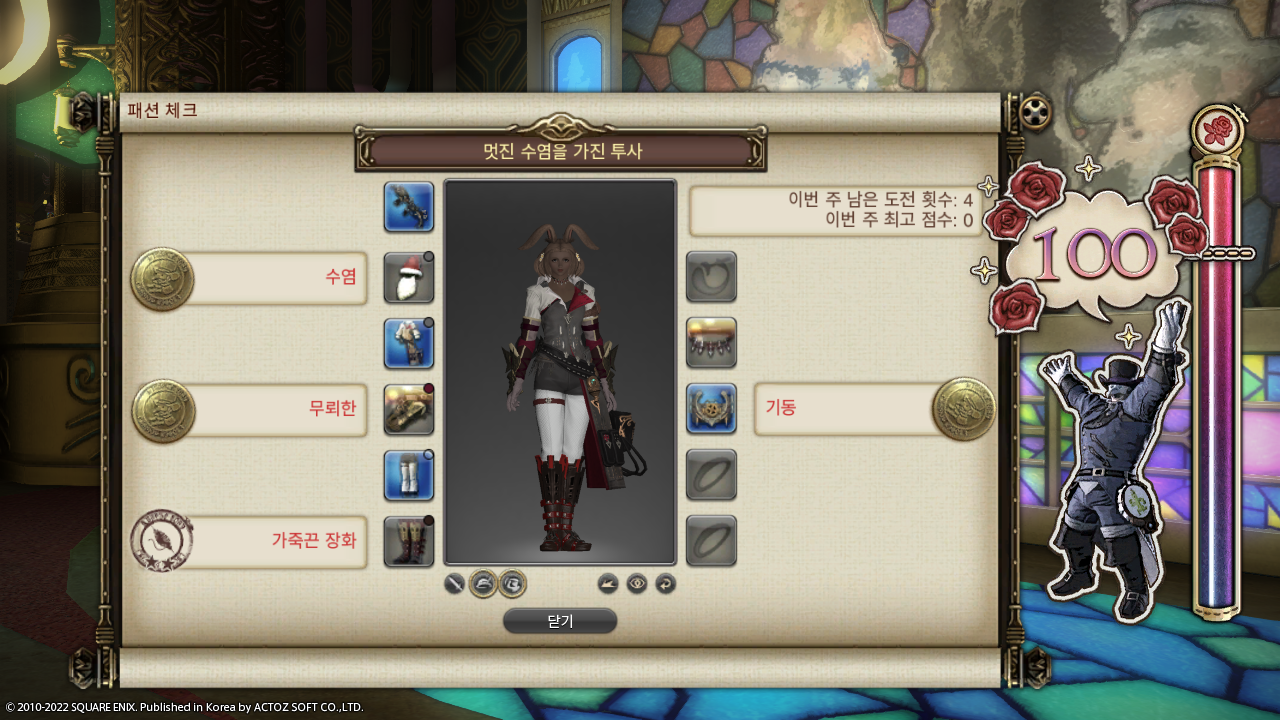 비에라 종족은 모자 종류의 머리 장비를 착용하면 모자가 보이지 않는 단점이 있지만, 패션체크에서는 표시 여부와 상관없이 채점에 반영되고 있습니다.