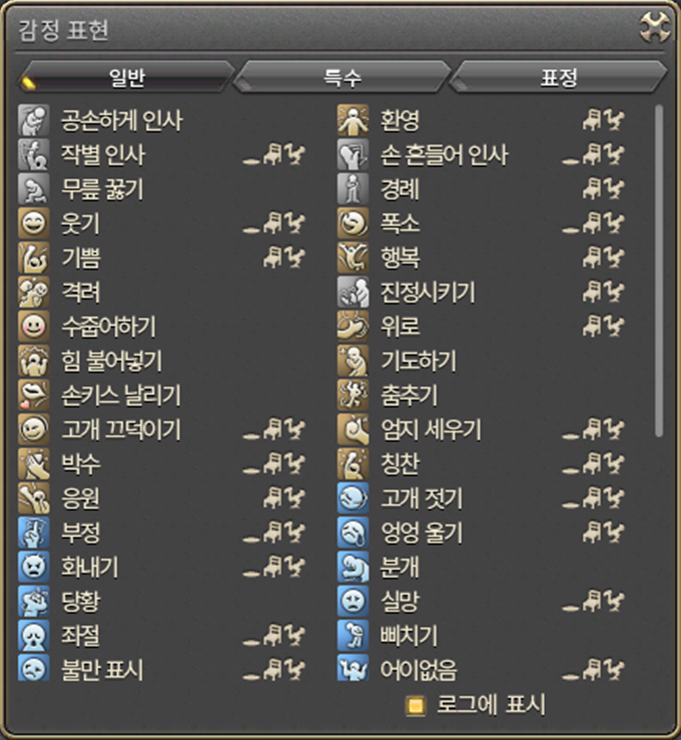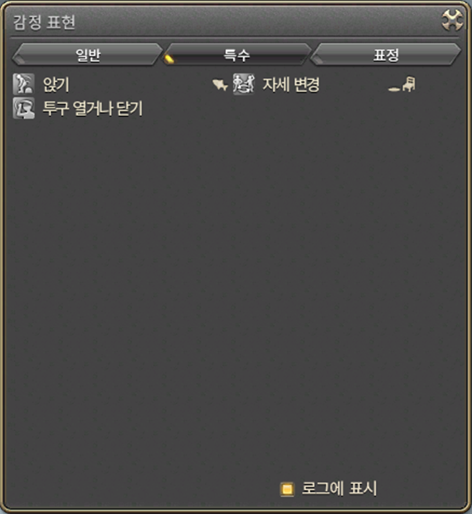 앉기, 기본 자세 변경을 할 수 있는 탭 의자에서 앉기를 사용할 경우, 의자에 앉을 수 있습니다. 자세변경은 캐릭터의 기본 자세가 변경되며, 다시 자세변경을 누르기 전까지 유지됩니다. 퀘스트를 통하여 배운 춤은 [특수 탭]에 추가됩니다. |