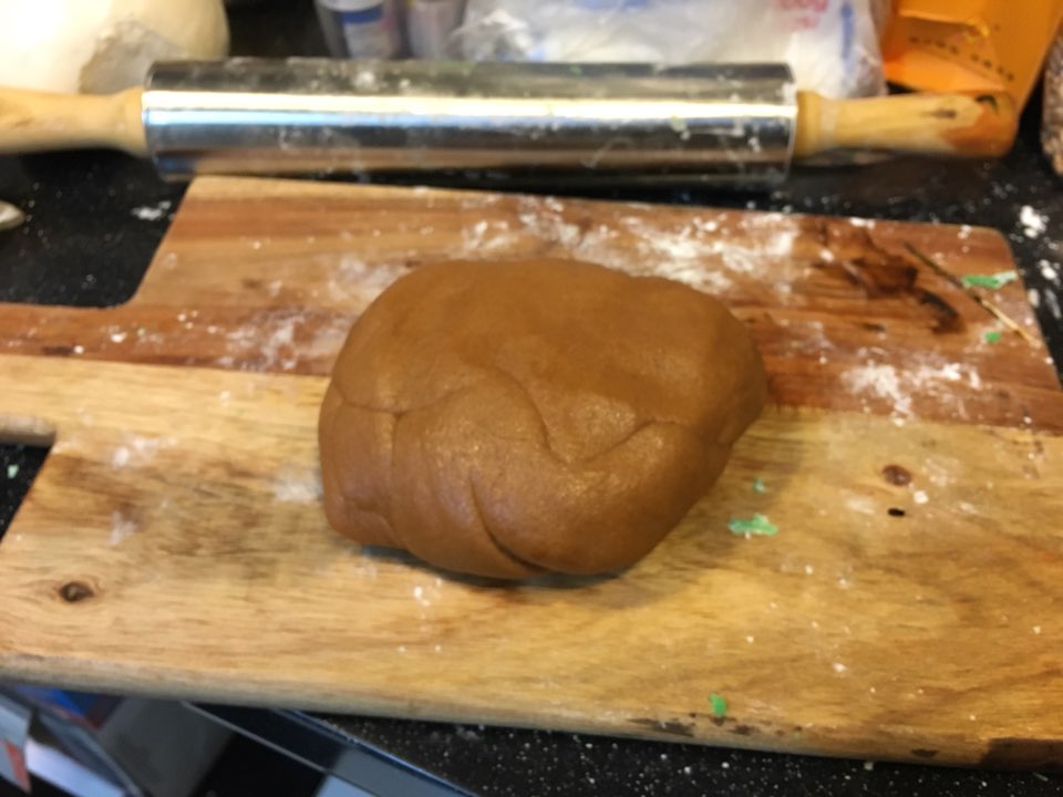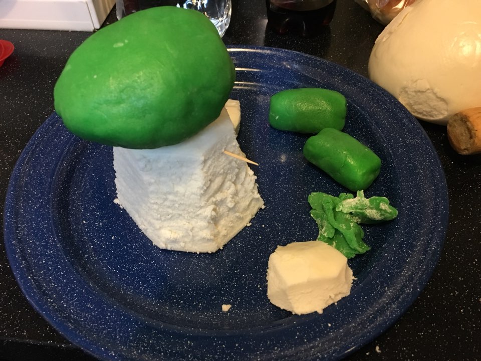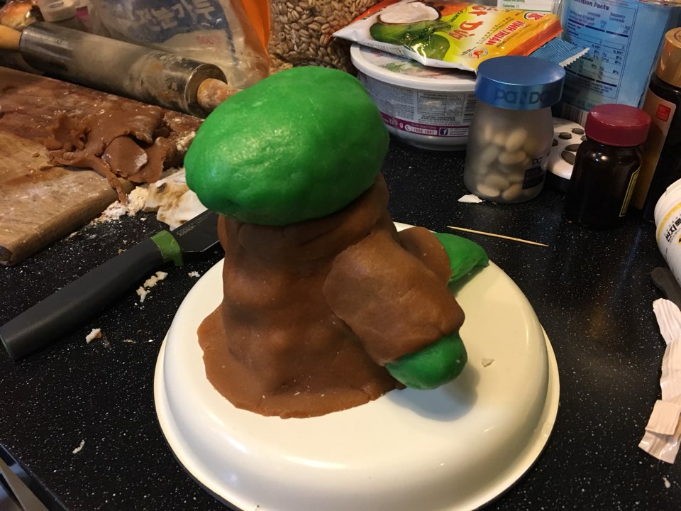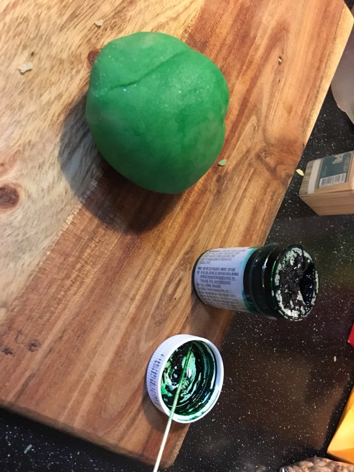 뼈대를 둘러쌀 마지팬 반죽을 염색해줍니다 (초록 갈색 노랑)