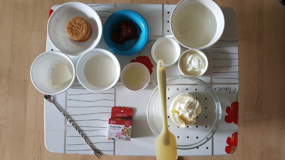 부순 다이제 쿠키 80g 녹인 무염버터 40g 크림치즈 250g 흑설탕 60g 플레인 요거트 40g 바닐라익스트랙 2g 레몬즙 5g 판젤라틴 6g 50% 정도 휘핑한 생크림 150g 딸기잼 70g 레드 식용색소 2방울