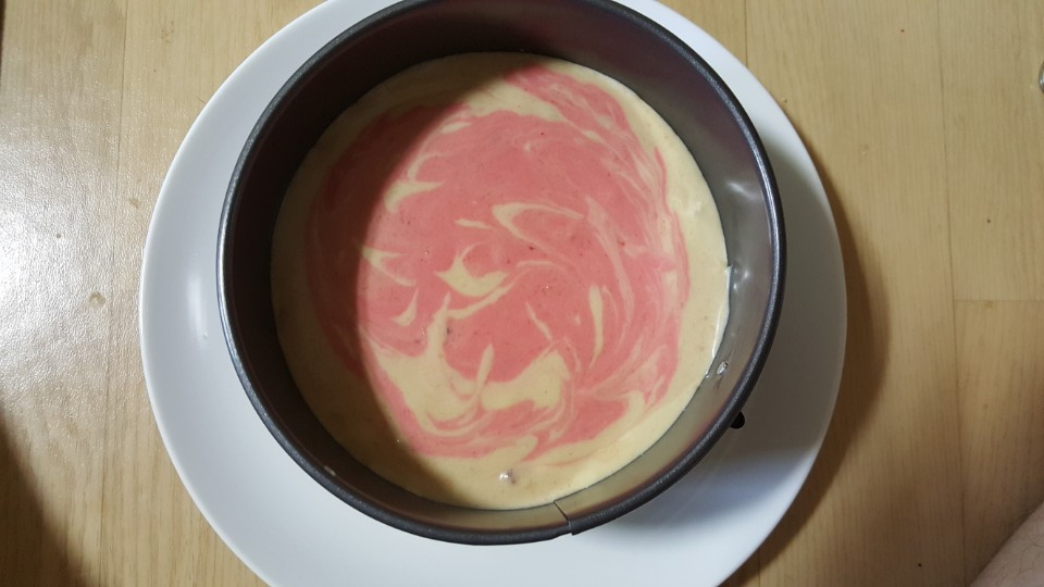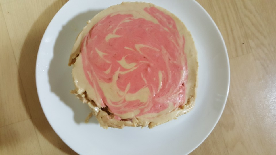 1. 부순 다이제 쿠키와 녹인 무염버터를 섞은 뒤 틀에 넣고 꾹꾹 눌러 깔고 냉장실에 넣어 둔다. 2. 크림치즈를 부드럽게 풀고 설탕, 플레인 요거트, 바닐라익스트랙, 레몬즙을 넣고 섞는다. 3. 찬물에 10분 정도 불린 판젤라틴의 물기를 제거하고 전자레인지에 10초 정도 돌려 녹여 넣고 섞은 뒤 50%정도 휘핑한 생크림을 넣고 섞는다. 4. 치즈 반죽을 다른 볼에 반정도 덜고 딸기잼을 넣고 섞은 뒤 또 다른 볼에 딸기잼을 섞은 치즈 반죽을 덜어내고 덜어낸 곳에 레드 식용색소를 조금 넣고 섞는다. 5. 틀에 하얀 반죽을 조금 남기고 붓고 연한 핑크, 진한 핑크색 순으로 부은 뒤 냉장실에서 1시간 정도 굳힌다. 6. 남겨둔 하얀 반죽을 붓고 평평히 한 뒤 냉장실에서 3시간 정도 굳힌다.