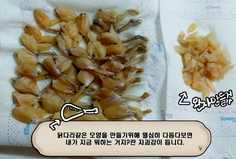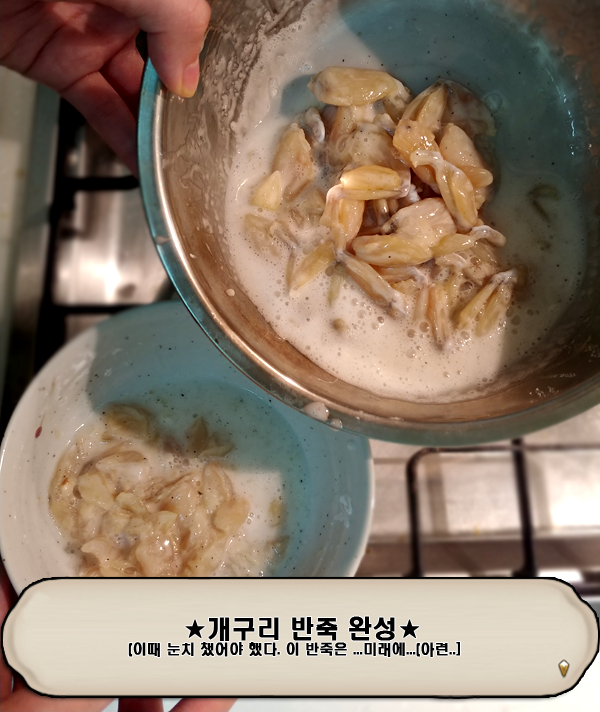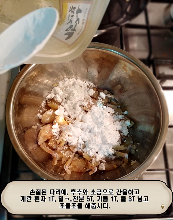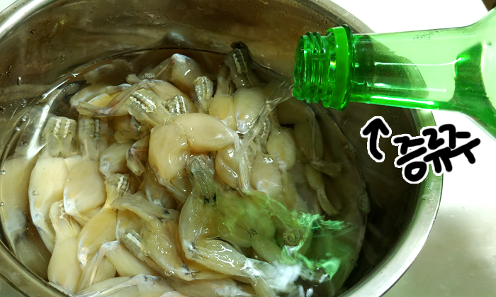 개구리는 해동을 시킨 후 찬물에 박박씻어서 증류주(SOJU)에 담가 최소 30분이상 재워둡니다.